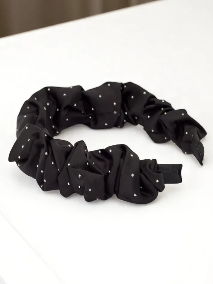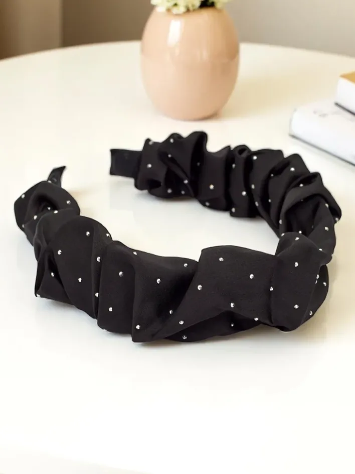 - Satynowa opaska do włosów, marszczona i ozdobiona cyrkoniami, to elegancki dodatek, który doda blasku każdej stylizacji. Miękka tkanina i błyszczące detale tworzą efekt glamour. Idealna na specjalne okazje i wieczorne wyjścia.
