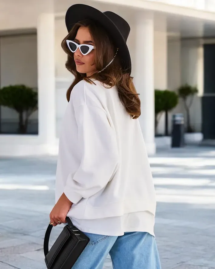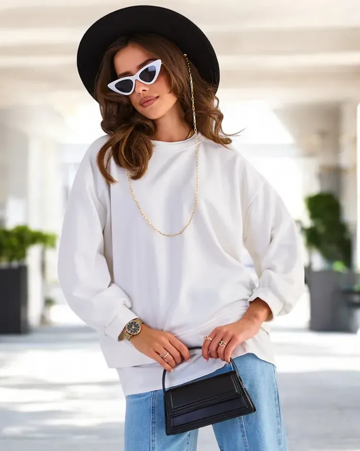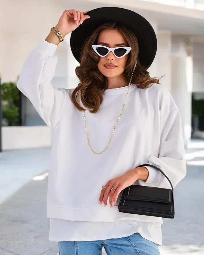 - Dodaj uroku swoim stylizacjom z naszą cieńszą bluzą. Obuwie posiada imitację wystającej koszuli. Wkładana przez głowę, z okrągłym dekoltem i długimi rękawami. Idealna na co dzień, gdy chcesz poczuć się swobodnie, a jednocześnie stylowo!