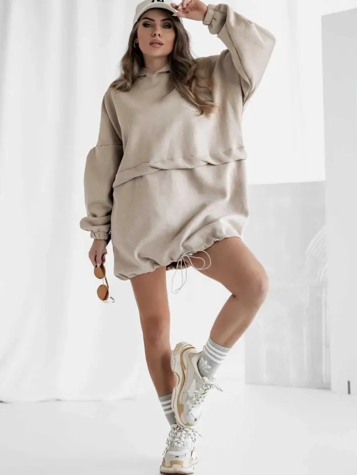 - Mega stylowa damska sukienka typu bluza, wykonana z materiału bawełnianego. Model z kapturem, posiada długie rękawy, ozdobną kieszeń oraz wycięcia po bokach. Dokładność pomiaru (+/-) 1 cm.