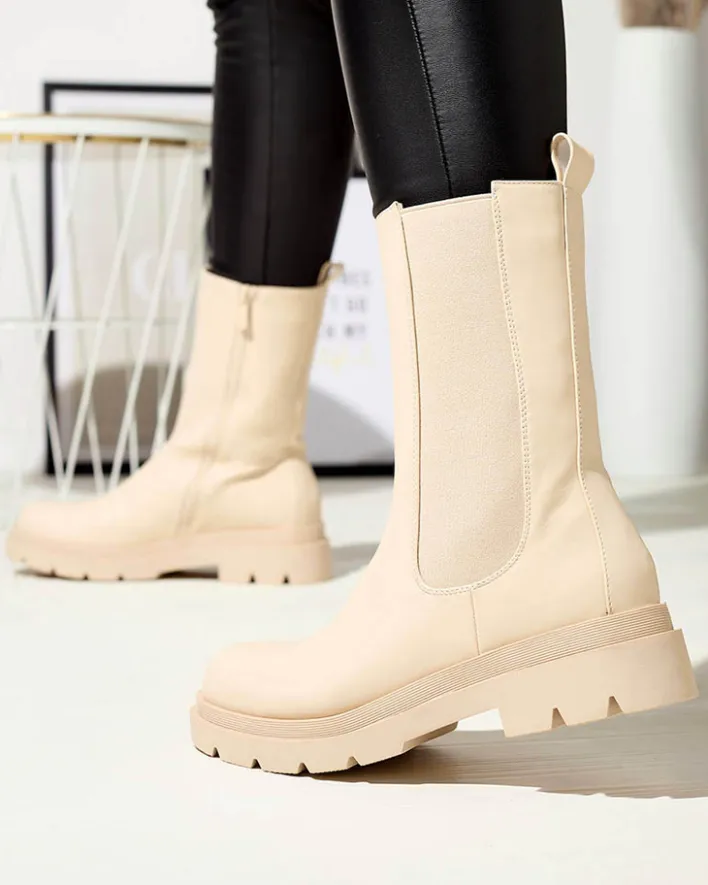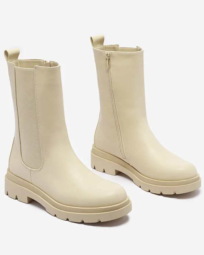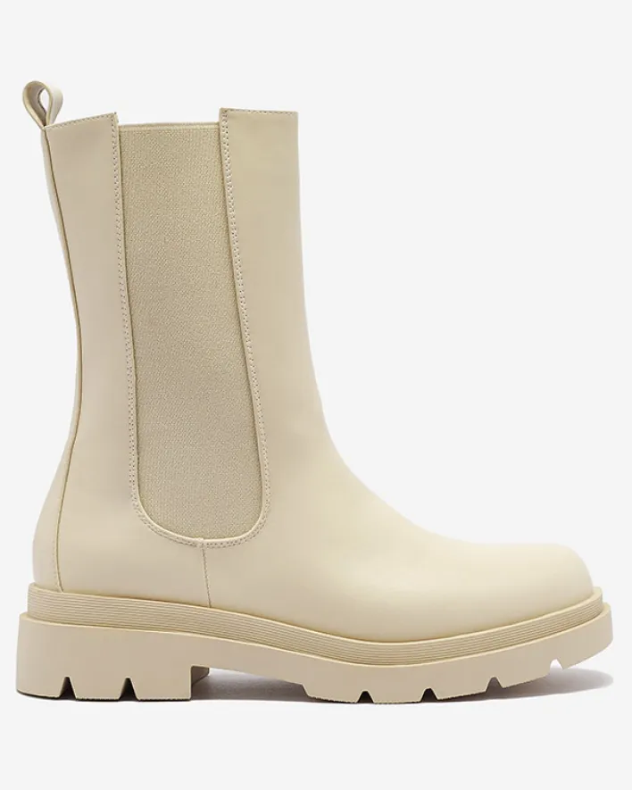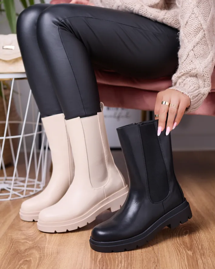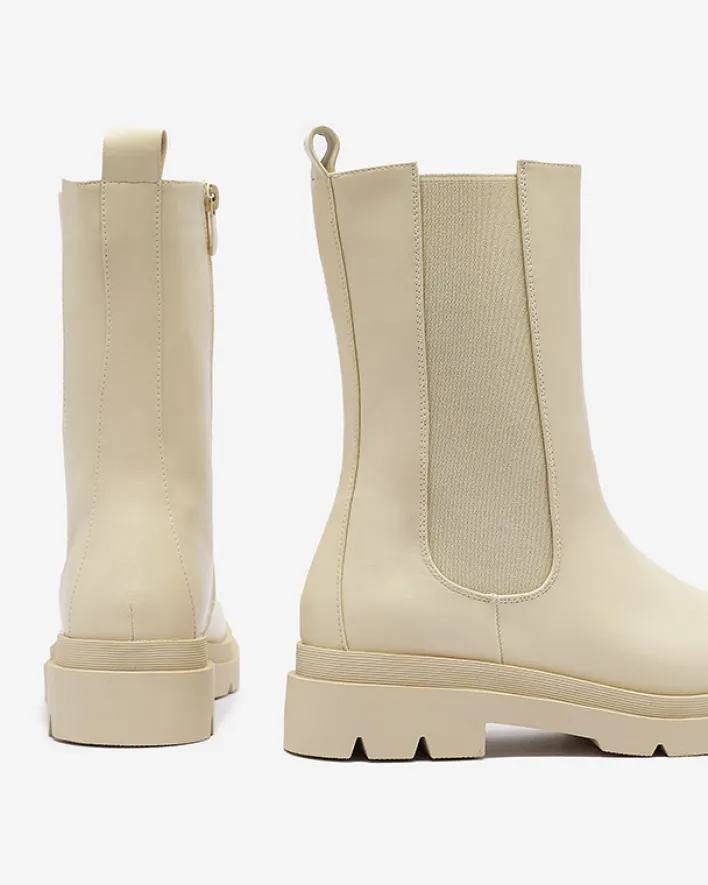 - Klasyczne damskie wysokie botki na płaskim obcasie. Cholewka wykonana jest ze skóry ekologicznej i posiada elastyczną wstawkę po boku. Środek wyłożony materiałem tkaninowym, zaś wkładka to skóra ekologiczna. BEŻOWE NIEOCIEPLANE DAMSKIE BOTKI VEDESA