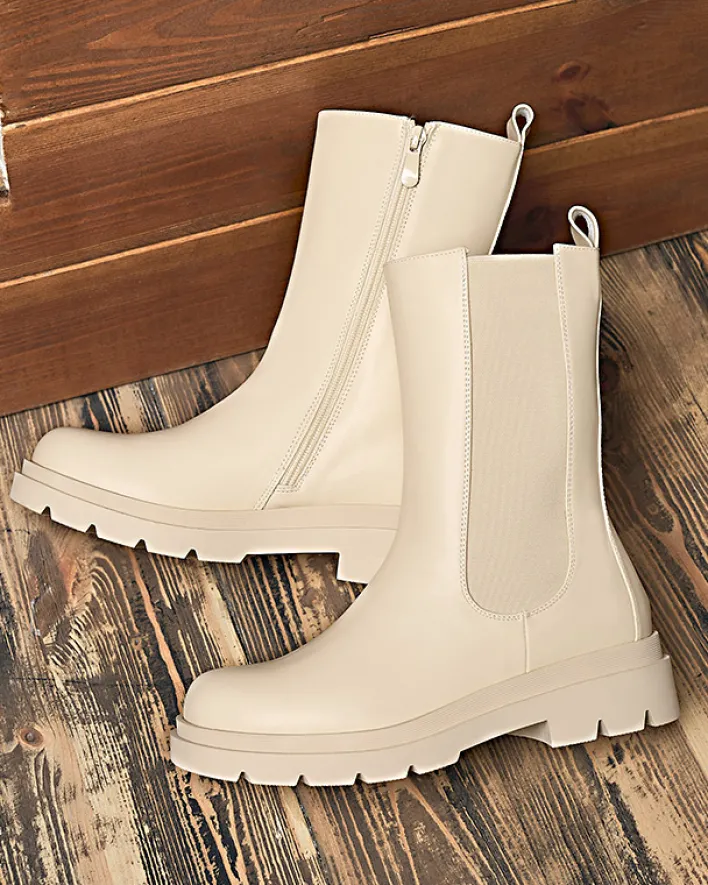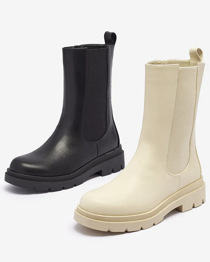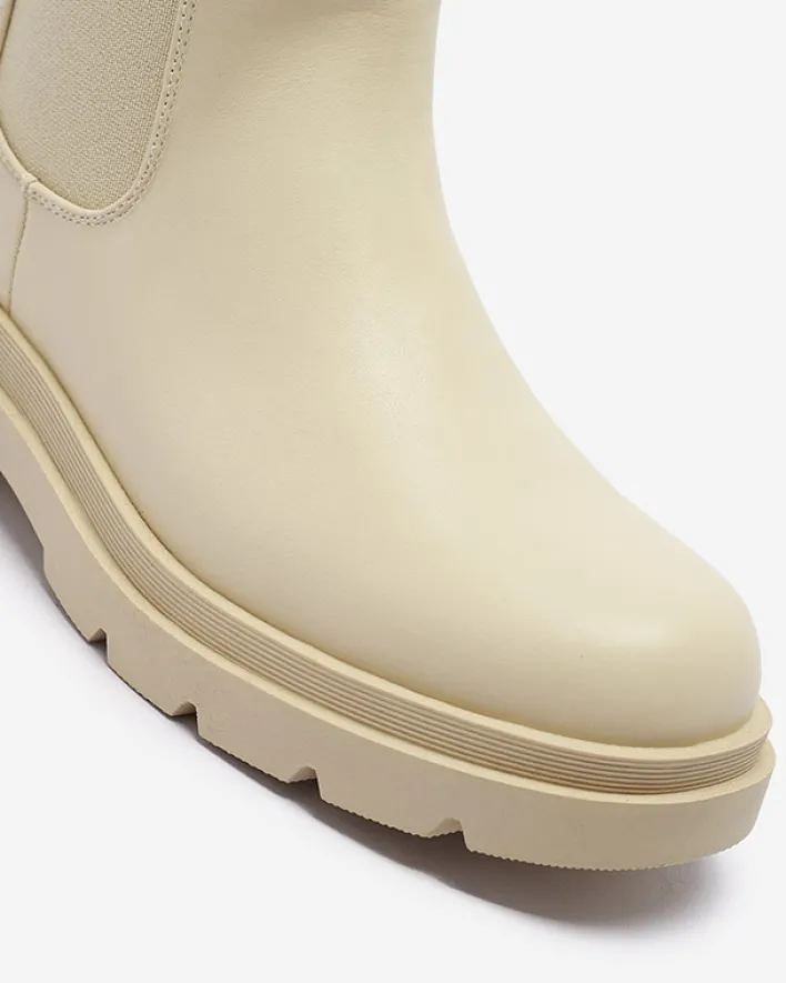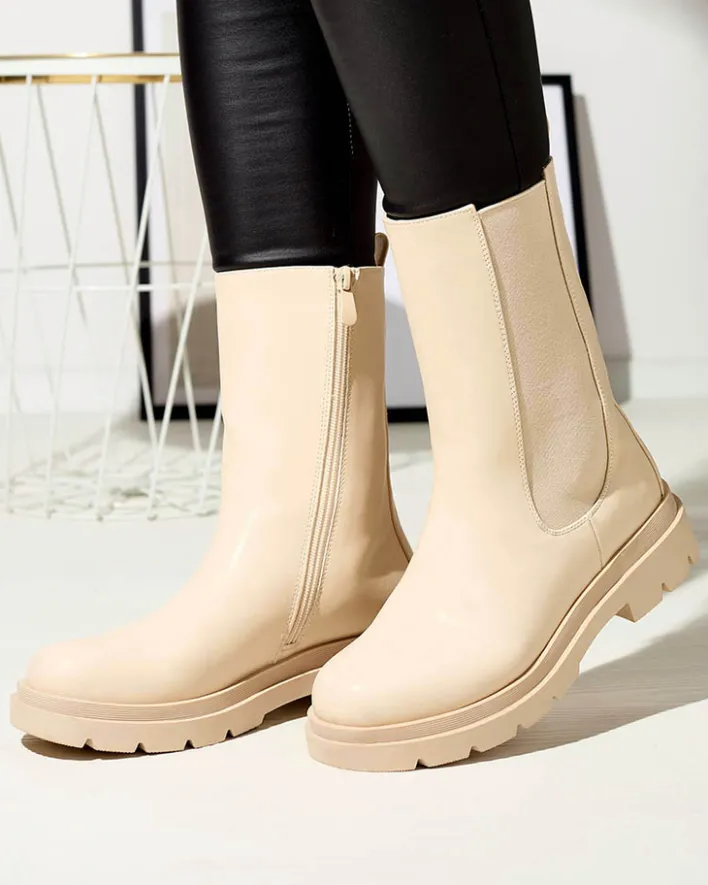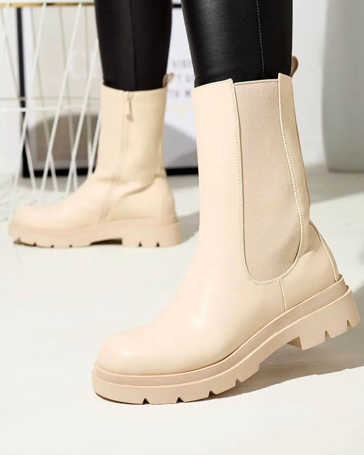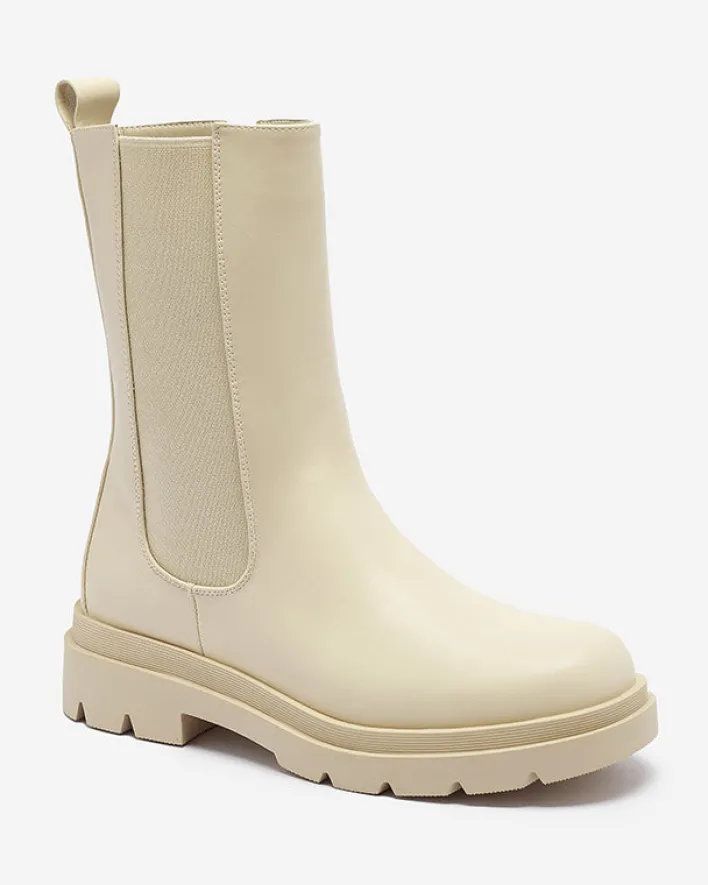 - Klasyczne damskie wysokie botki na płaskim obcasie. Cholewka wykonana jest ze skóry ekologicznej i posiada elastyczną wstawkę po boku. Środek wyłożony materiałem tkaninowym, zaś wkładka to skóra ekologiczna. BEŻOWE NIEOCIEPLANE DAMSKIE BOTKI VEDESA