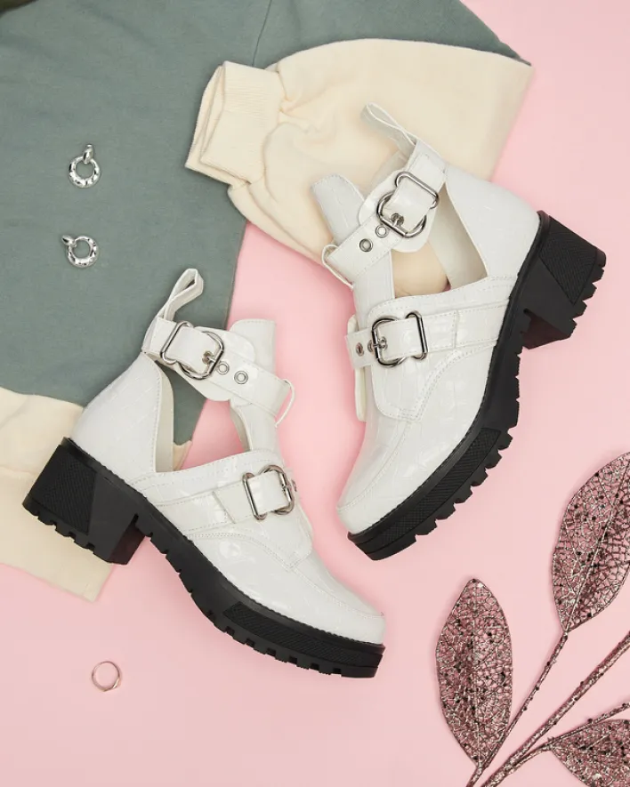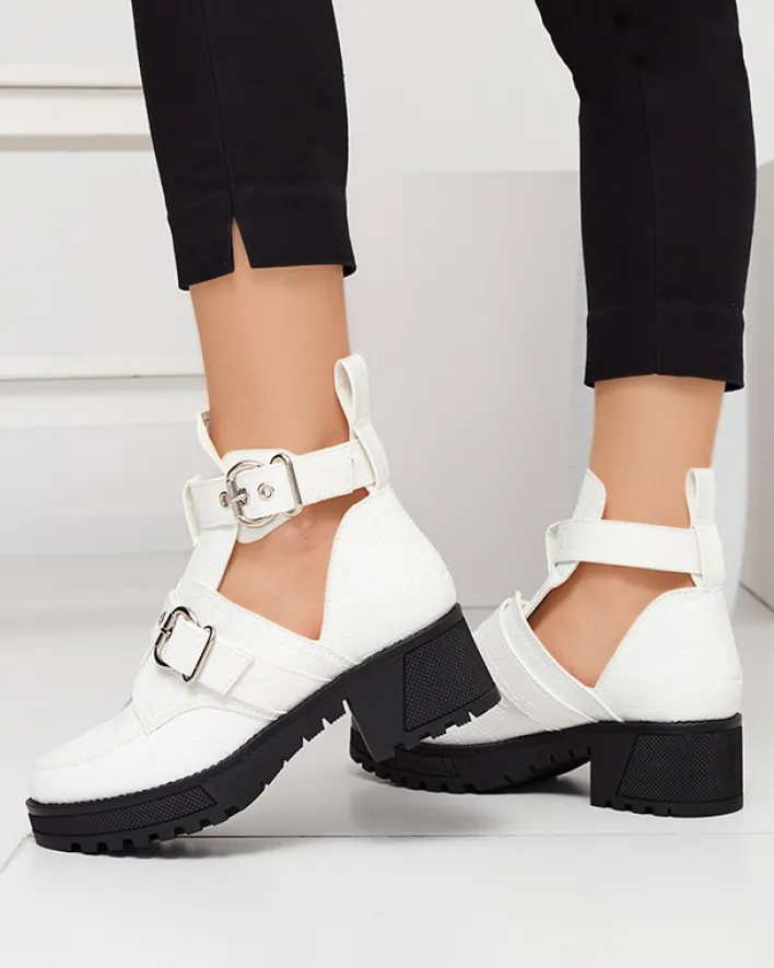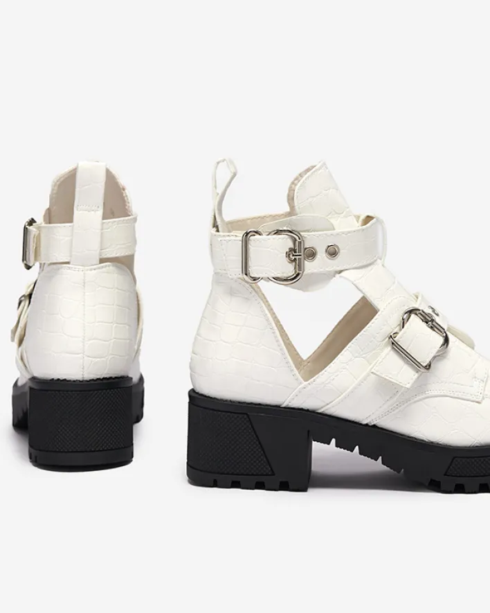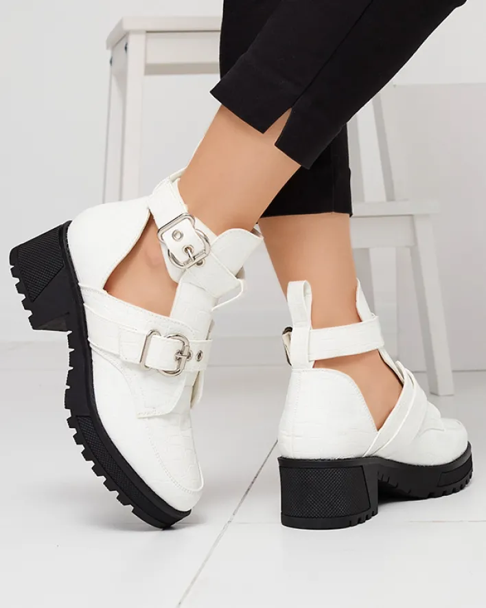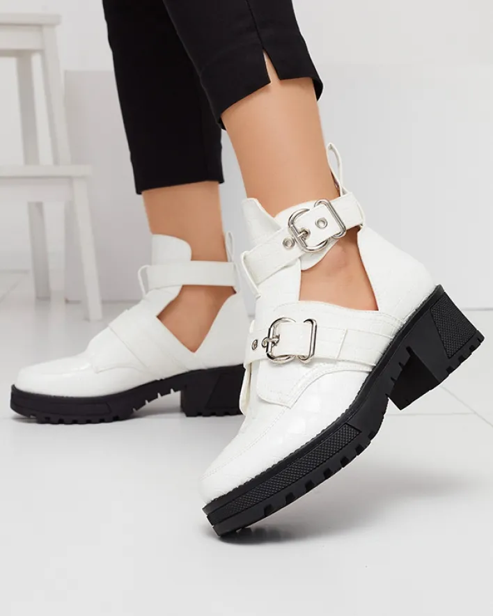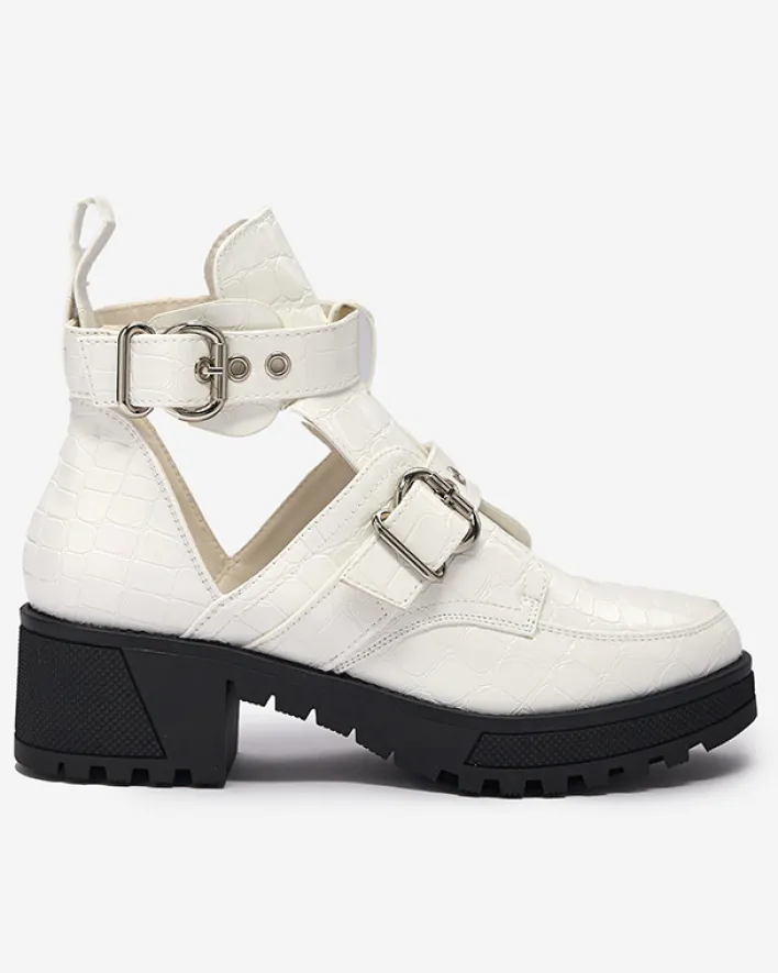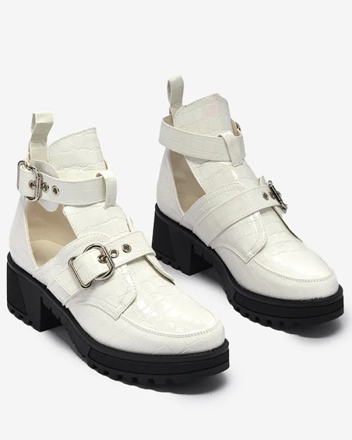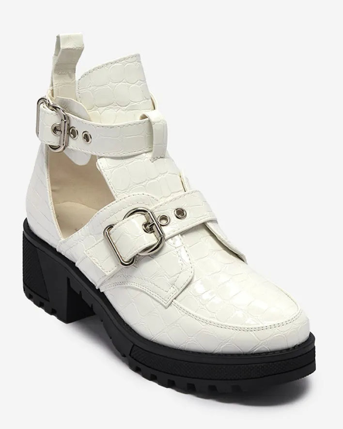 - Damskie botki na grubszej podeszwie wykonane ze skóry ekologicznej lakierowanej, która wykończona jest ozdobnym tłoczeniem i klamrami. Buty posiadają wycięcie oraz zapięcie na sprzączkę. BIAŁE BUTY BOTKI DAMSKIE NIEOCIEPLANE MALEVIB