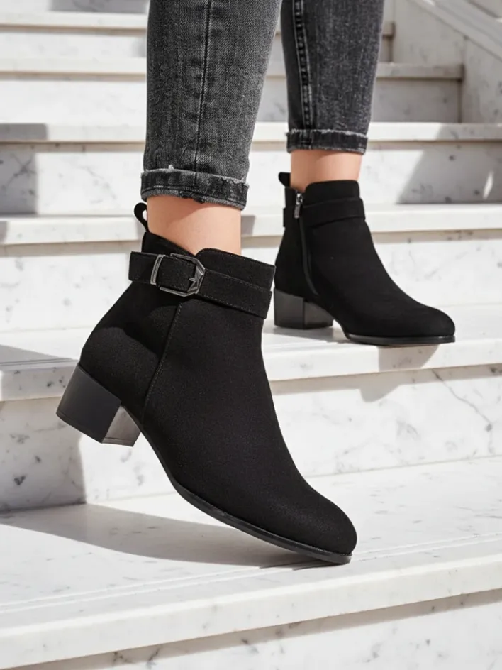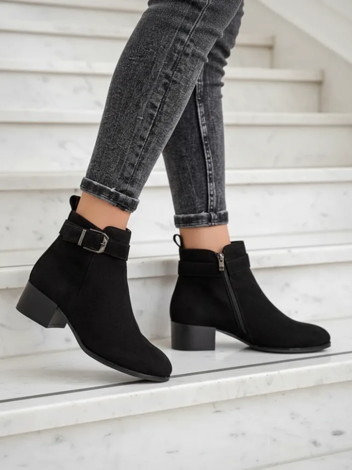 - Stylowe damskie botki to idealne rozwiązanie na chłodniejsze dni. Eko zamszowa cholewka jest zapinana na suwak, a w środku znajduje delikatne ocieplenie. Model na płaskim obcasie z okrągłym noskiem. Super dodatek do Twoich casualowych outfitów!