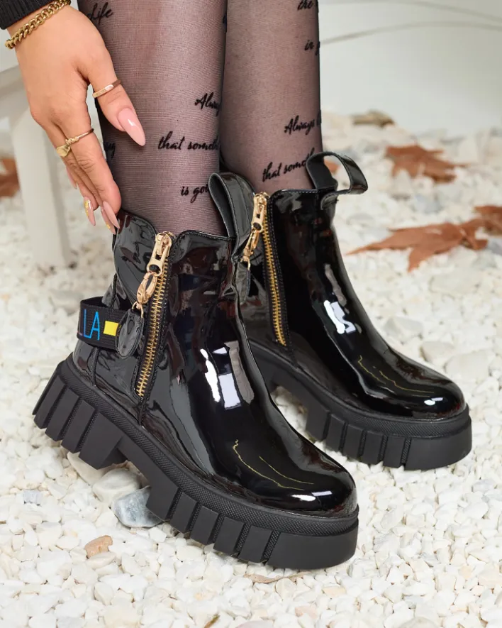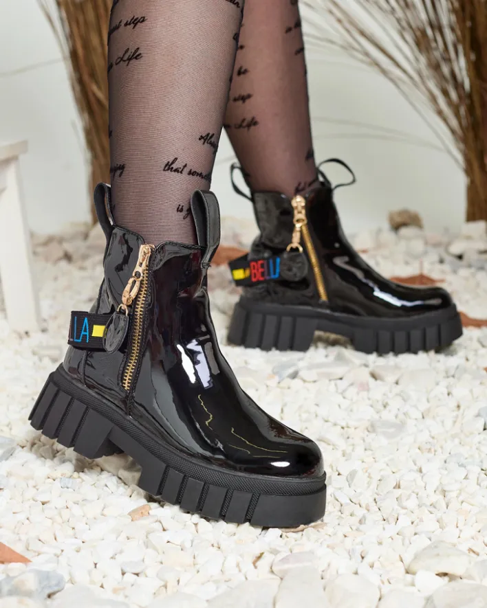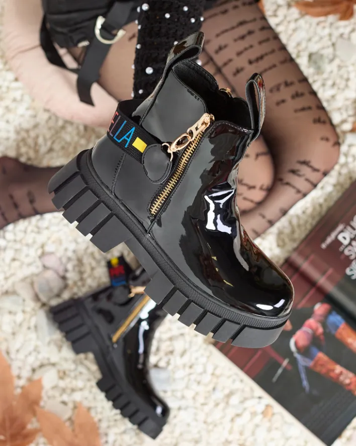 - Stylowe botki na grubszej podeszwie wykonane ze skóry ekologicznej lakierowanej. Nosek zaokrąglony, środek wypełniony futerkiem. Obuwie zapinane na zamek. Model posiada ozdobny suwak i odpinany paseczek. Świetne buty do eleganckich jesiennych kreacji!