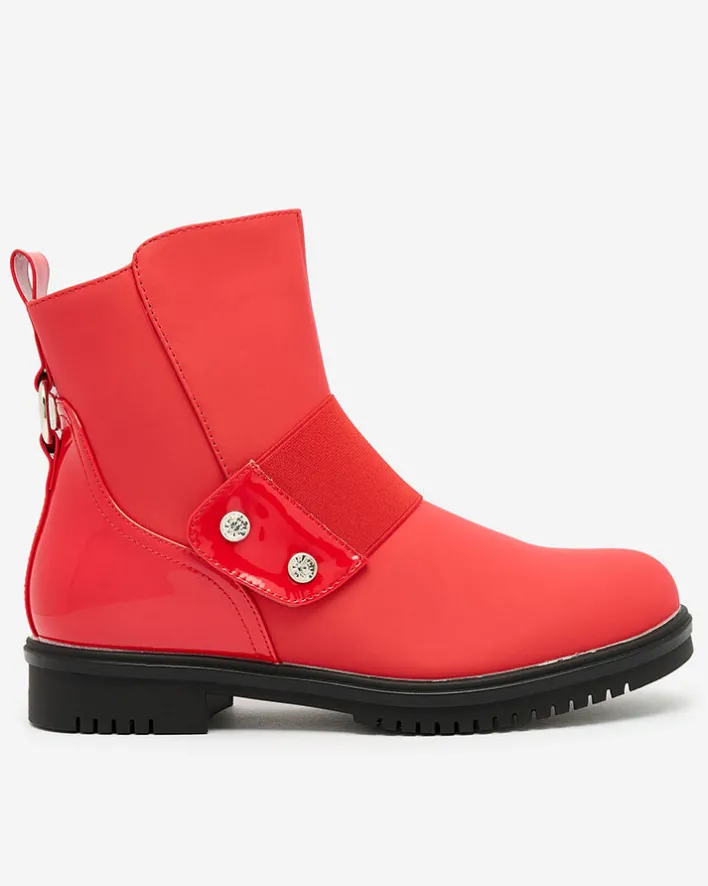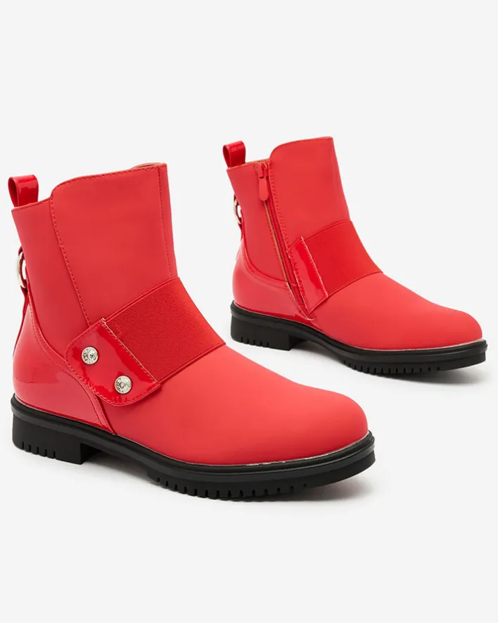 - Eleganckie botki damskie z ozdobnym paskiem. Model zapinany na suwak, wykonany ze skóry ekologicznej matowej i lakierowanych wstawek. Wyposażone w grubszą podeszwę zapewniającą komfort noszenia!