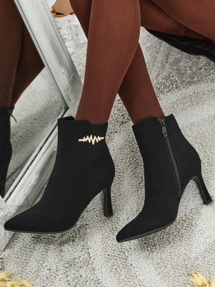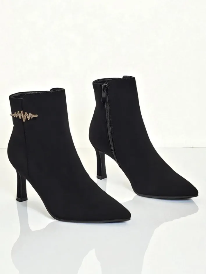 - Stylowe damskie botki ze skóry ekologicznej matowej – to idealne rozwiązanie na chłodniejsze dni. Model zapinany na suwak, posiada ocieplenie w formie futerka. Model na szpilce i ze spiczastym noskiem. Zdobiony elementem z cyrkonii.