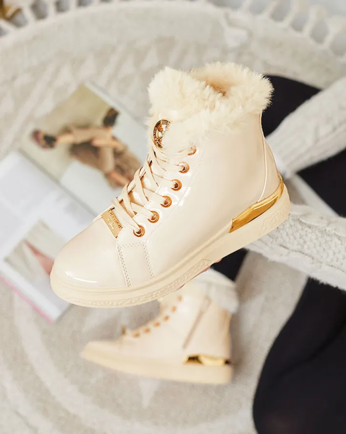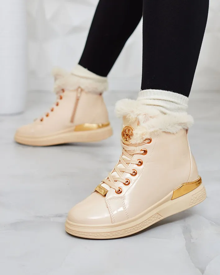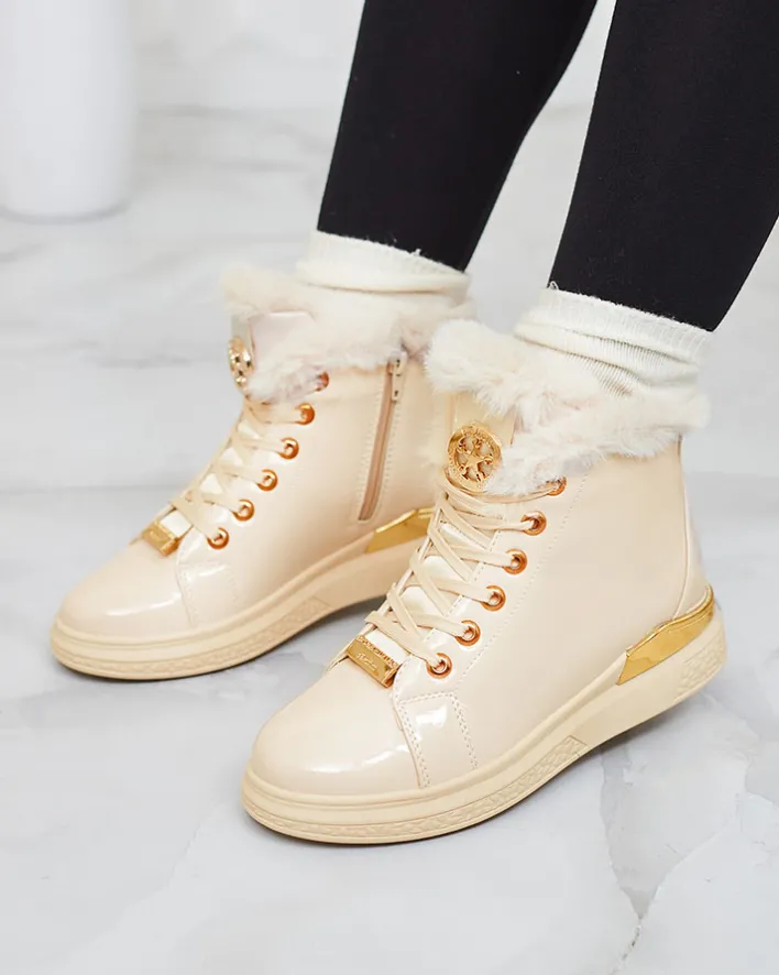 - Ponadczasowe damskie lakierowane botki na płaskim obcasie dodają szyku każdej stylizacji. Cholewka wykonana ze skóry ekologicznej lakierowanej. W środku wypełnienie w formie futerka. Obuwie sznurowane i zapinane na suwak, podeszwa gumowa.