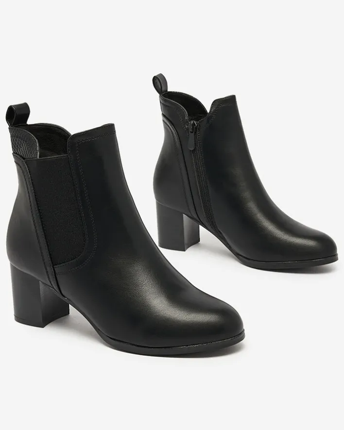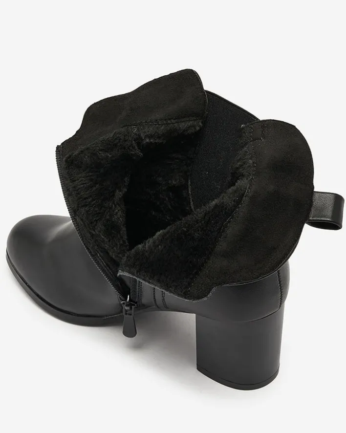 - Stylowe damskie botki na niskim słupku. Cholewka wykonana ze skóry ekologicznej, wnętrze ocieplone futerkiem. Obuwie jest zapinane na suwaki po bokach. Świetny wybór na jesień!