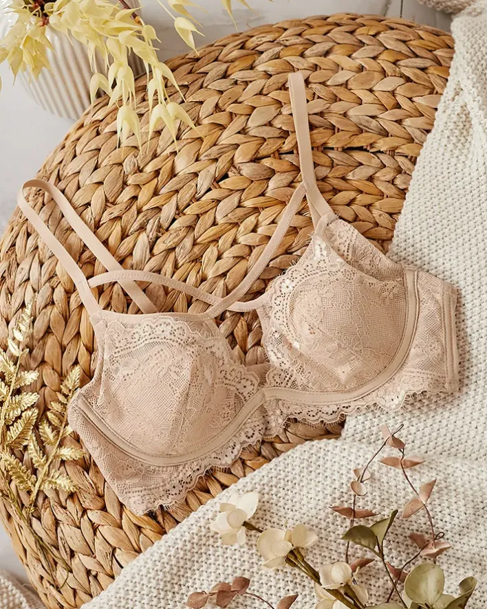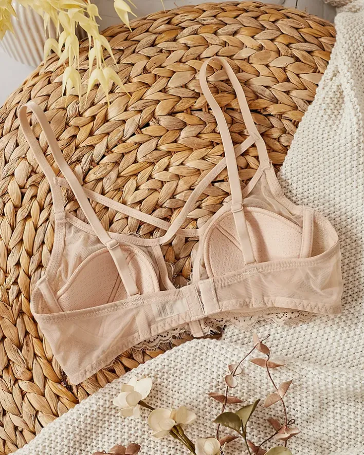 - Wyjątkowy damski biustonosz koronkowy z ozdobnymi paseczkami. Model posiada fiszbiny i jest zapinany z tyłu na zapięcie na haftki. Ramiączka posiadają regulację długości. UWAGA: Dokładność pomiaru (+/-) 1 cm.