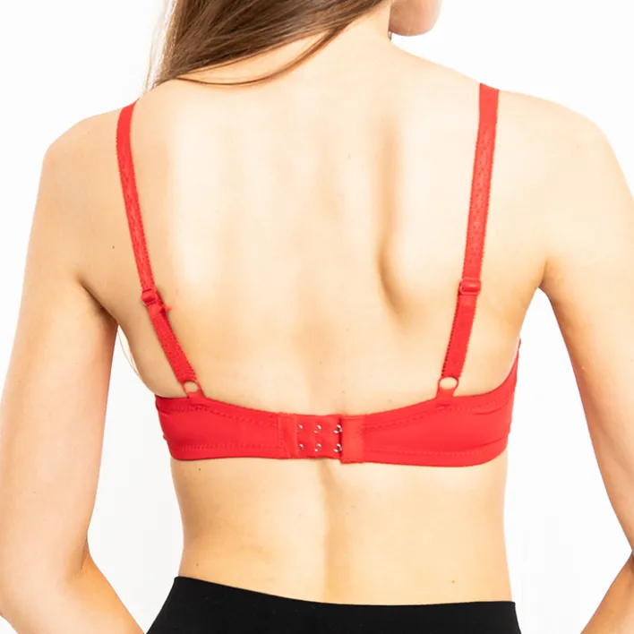 - Śliczny damski usztywniany biustonosz z koronkowymi miseczkami. Model zapinany z tyłu, posiada regulowane i odpinane ramiączka.