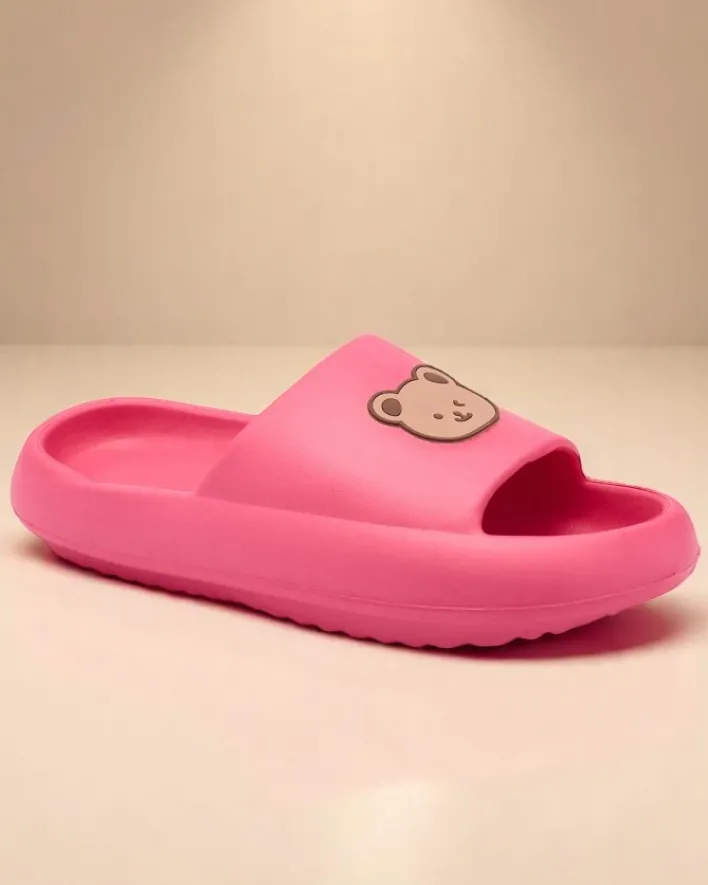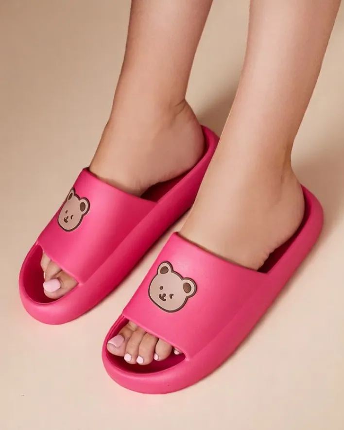 - Świetne damskie gumowe klapki na płaskiej podeszwie, paseczek zdobiony uroczym misiem. Idealny wybór na wakacje!