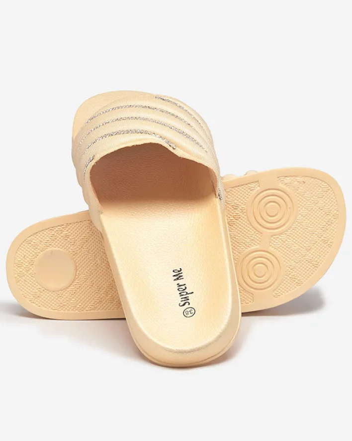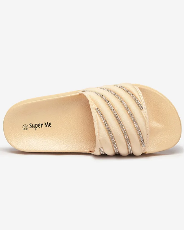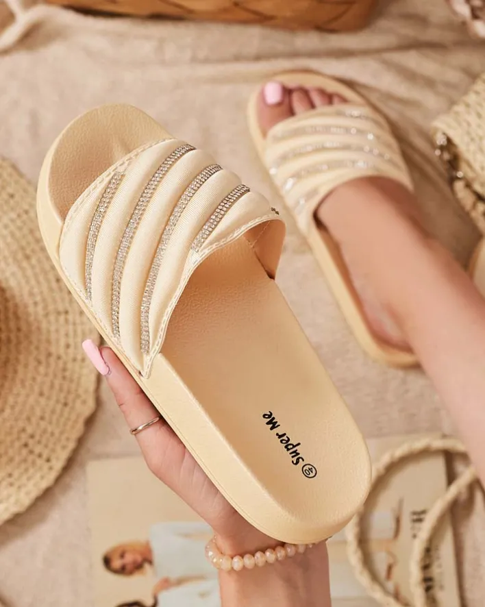- Prześliczne damskie klapki na płaskiej podeszwie, zdobione drobnymi cyrkoniami, wkładka wykonana z tworzywa gumowego. Ta piękna para musi znaleźć się w Twojej walizce podczas urlopu!