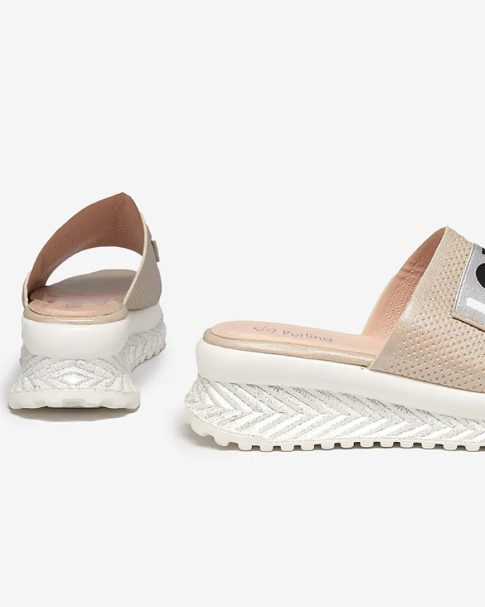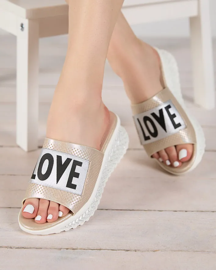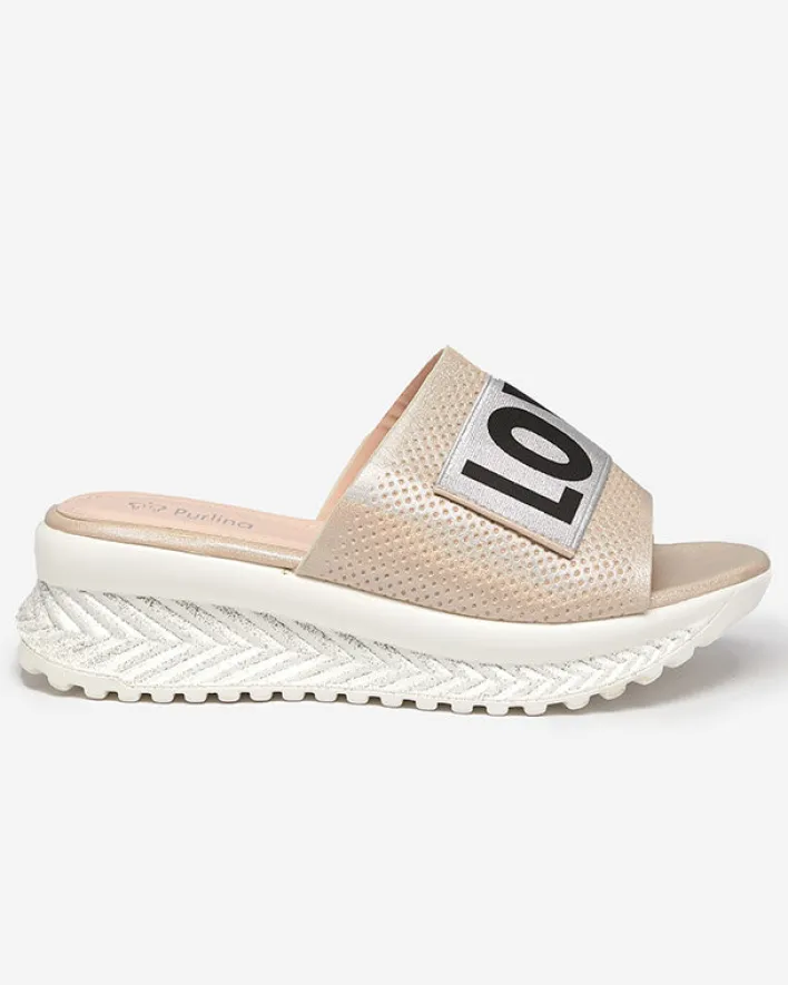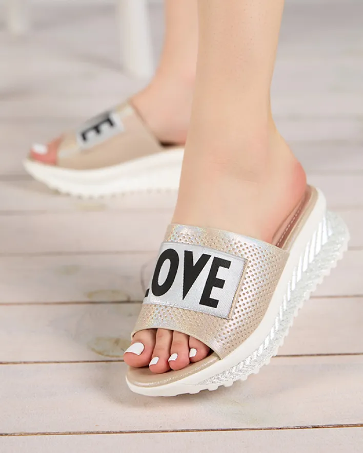 - Modne damskie klapki na niskim koturnie, wykonane z miękkiej skóry ekologicznej. Model wykończony brokatem. Dodatkowo napis na paseczku. Załóż je na lato do krótkich spodenek!