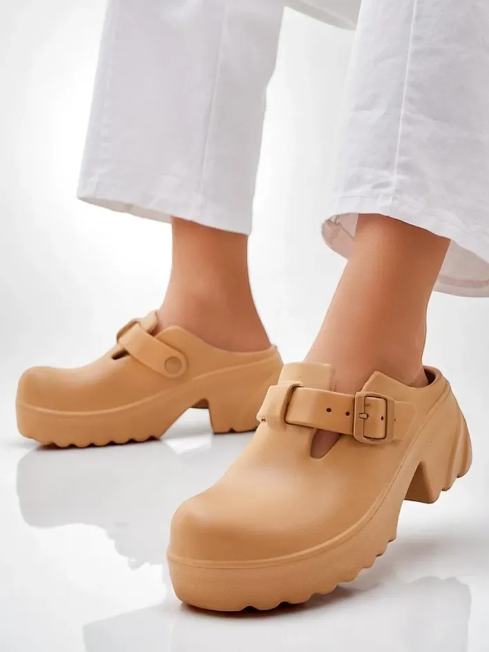 - Podkreśl swój letni styl i ciesz się wygodą dzięki tym klapkom na obcasie. Model wykonany z tworzywa sztucznego gumowego. Zdobione okrągłym noskiem. Platforma jest zdobiona klamerkami. Są idealnym wyborem na letnie dni!