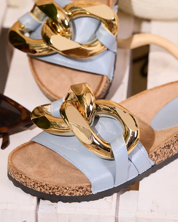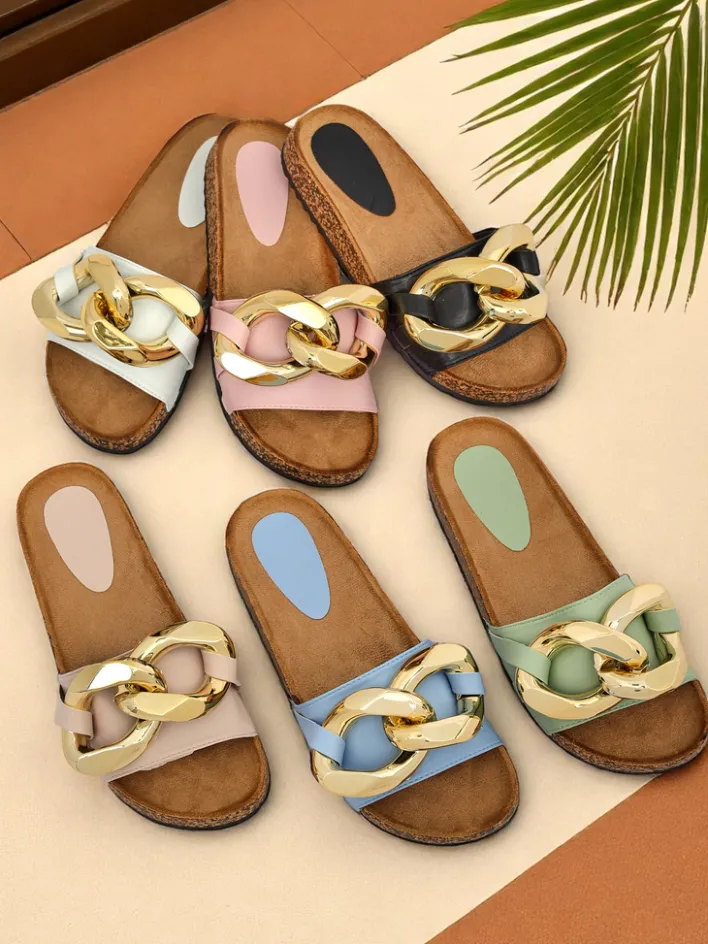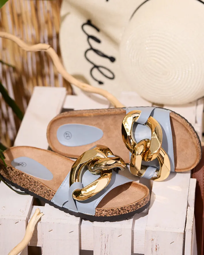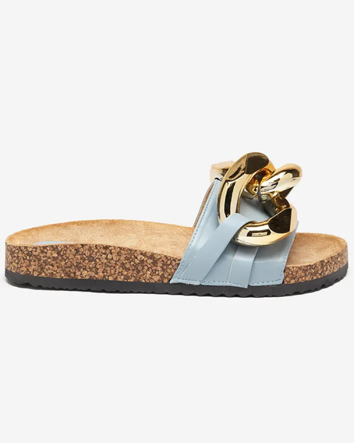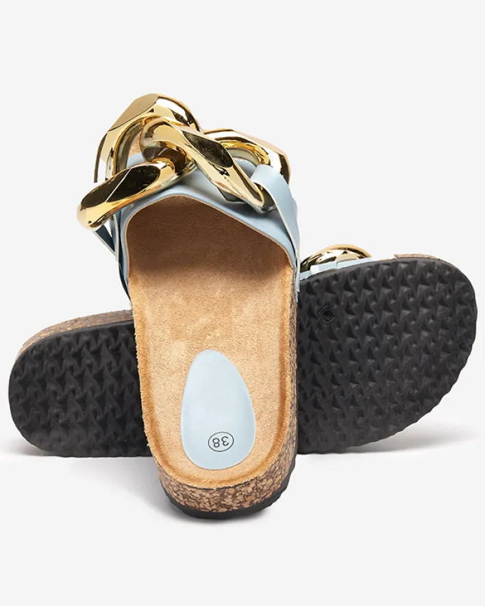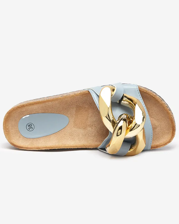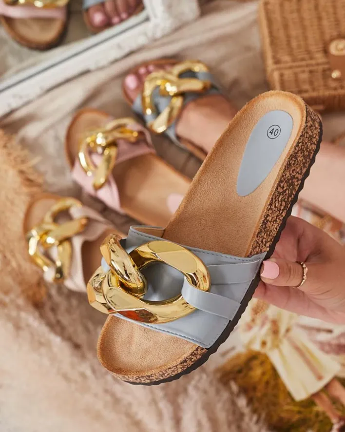 - Stylowe klapki damskie wykonane ze skóry ekologicznej, posiadają złotą ozdobę na paseczku. Model na płaskiej i gumowej podeszwie z materiału a’la korek. Świetny dodatek do wielu letnich stylizacji!
