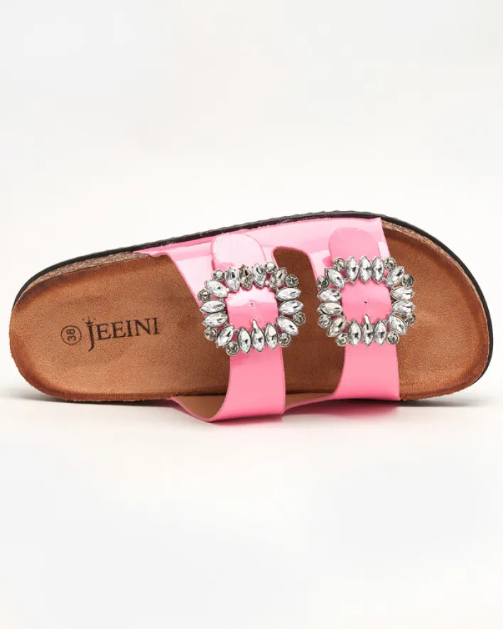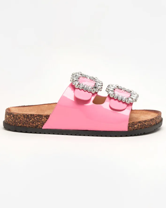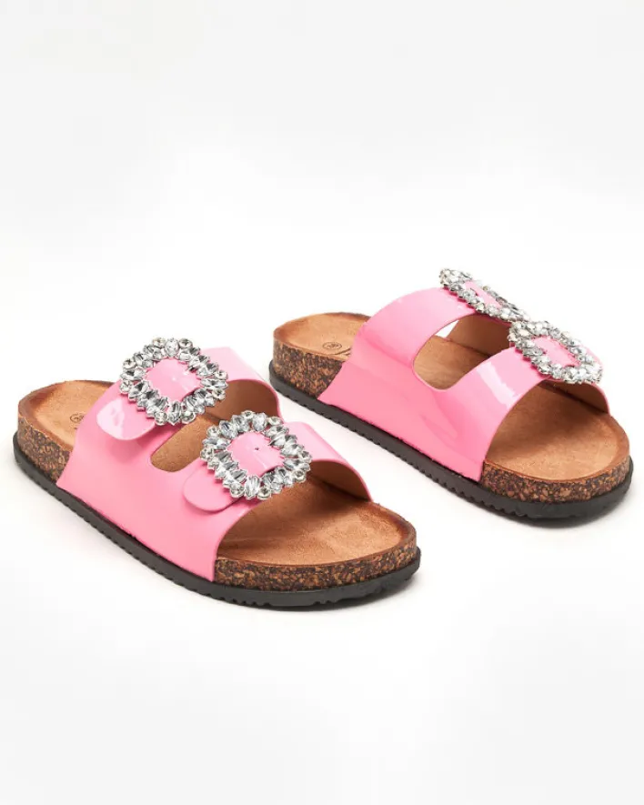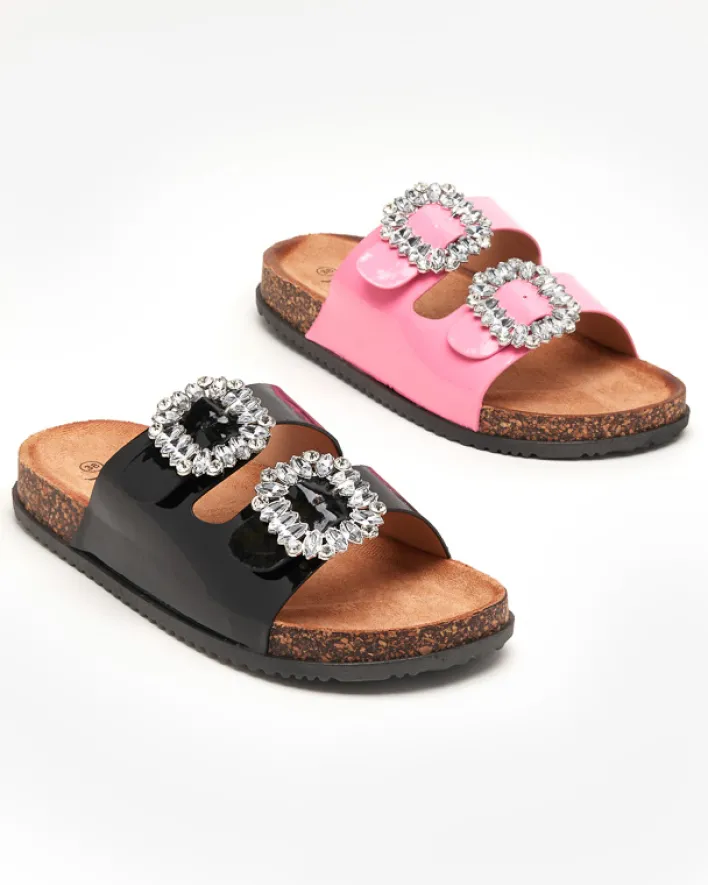 - Prześliczne damskie klapki wykonane ze skóry ekologicznej lakierowanej. Model z klamrami zdobionymi cyrkoniami, posiadają eko-zamszową wkładkę. Gumowa podeszwa zdobiona materiałem a’la korek. Super dodatek do Twoich casualowych outfitów!
