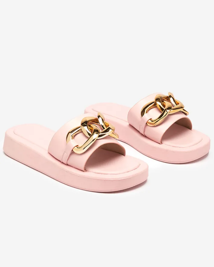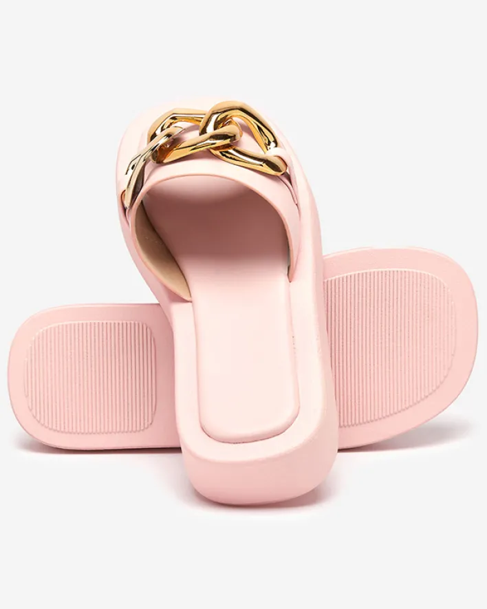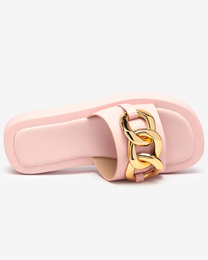- Mega modne damskie klapki wykonane ze skóry ekologicznej. Model zdobiony dużym plastikowym łańcuszkiem w złotym kolorze, posiada eko-skórzaną wkładkę. Super dodatek do Twoich letnich casualowych outfitów!