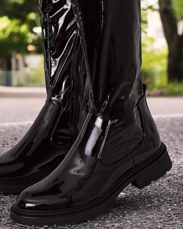 - Stylowe damskie kozaki na płaskiej podeszwie i z cholewką za kolano. Cholewka wykonana jest ze skóry ekologicznej lakierowanej i posiada futerkową wkładkę. Model zapinany na zamek z okrągłym noskiem. Idealne do tworzenia eleganckich outfitów!