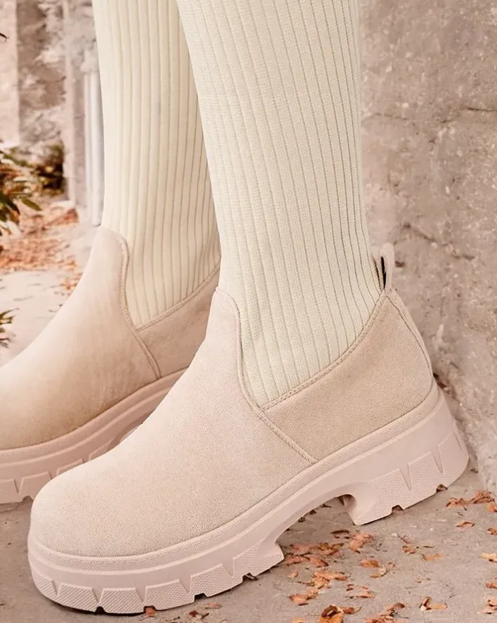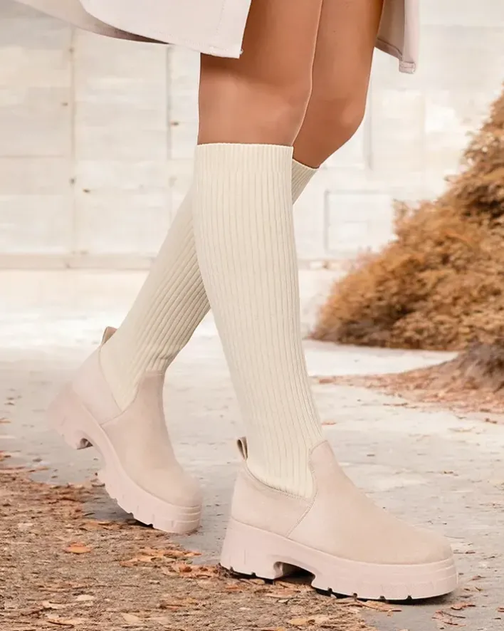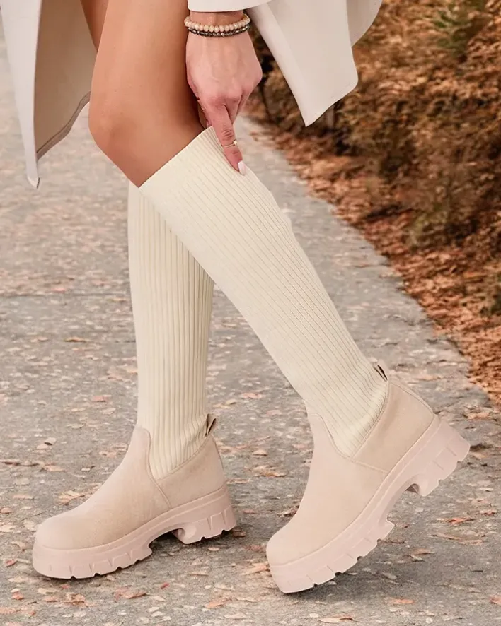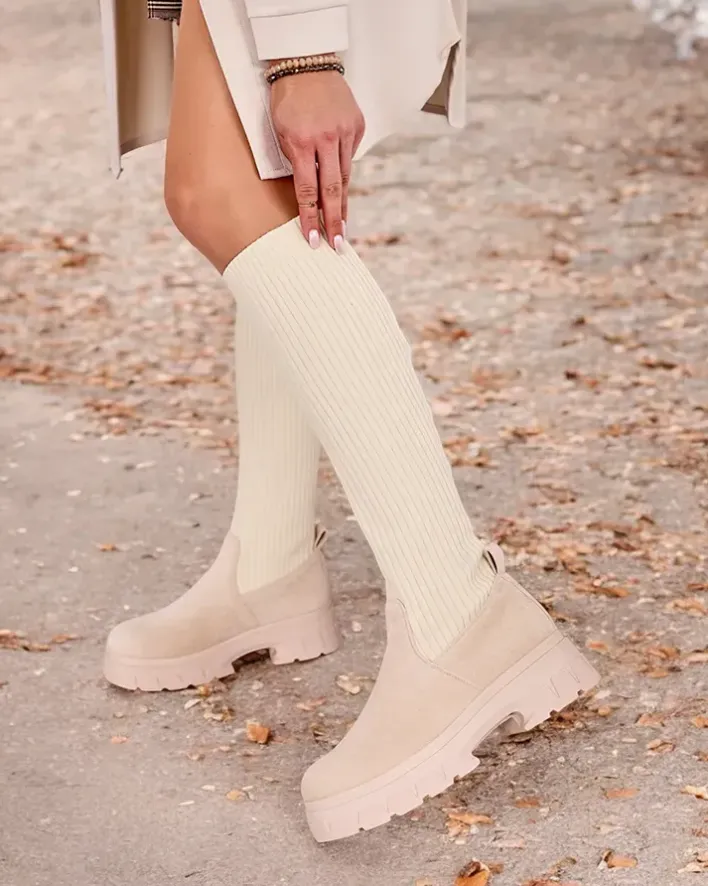 - Stylowe damskie kozaki do kolana na płaskim obcasie. Cholewka wykonana jest z elastycznego materiału tkaninowego i eko zamszowych wstawek, w środku futerkowa wkładka. Model wsuwany. Idealne do codziennych jesiennych outfitów!