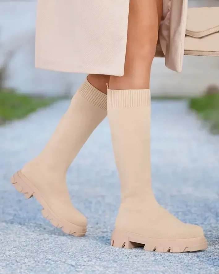 - Stylowe damskie kozaki na platformie. Cholewka wykonana jest z elastycznego materiału tkaninowego, w środku tkaninowa wkładka. Model wsuwany. Idealne do codziennych jesiennych outfitów!