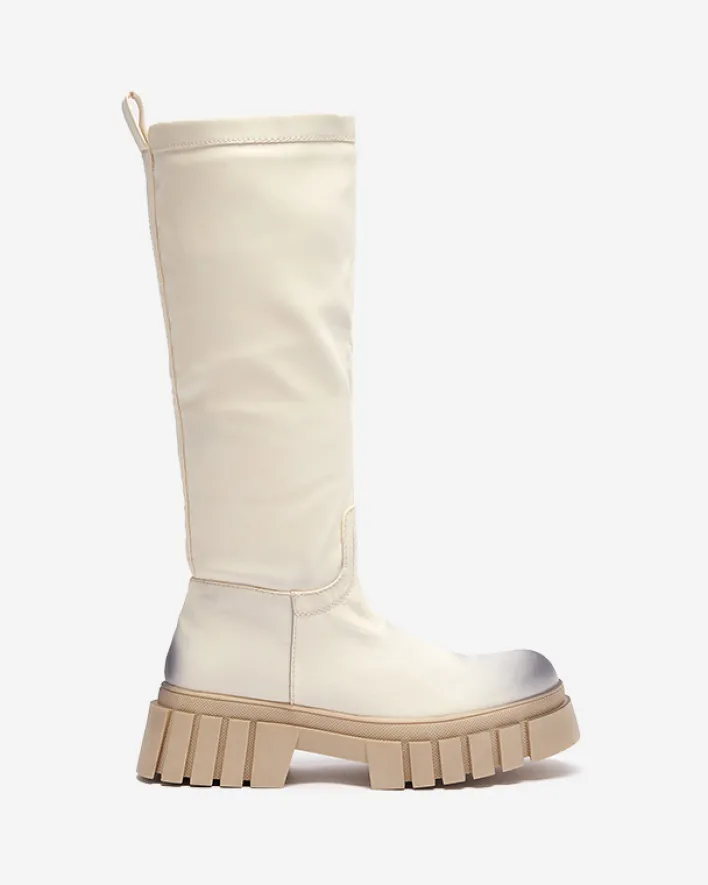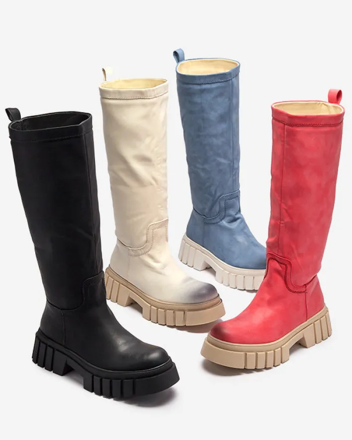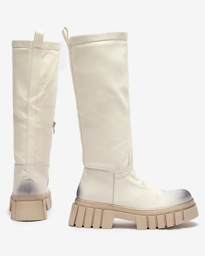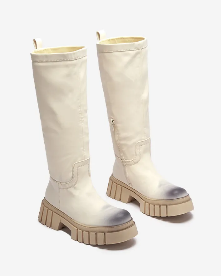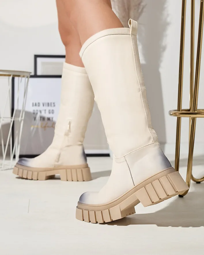 - Delikatnie cieniowane damskie kozaki do połowy łydki, wykonane ze skóry ekologicznej. Model na płaskim obcasie. Posiada ocieplenie w formie delikatnego futerka. Na nosku i pięcie ozdobne przebarwienia.