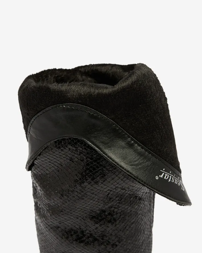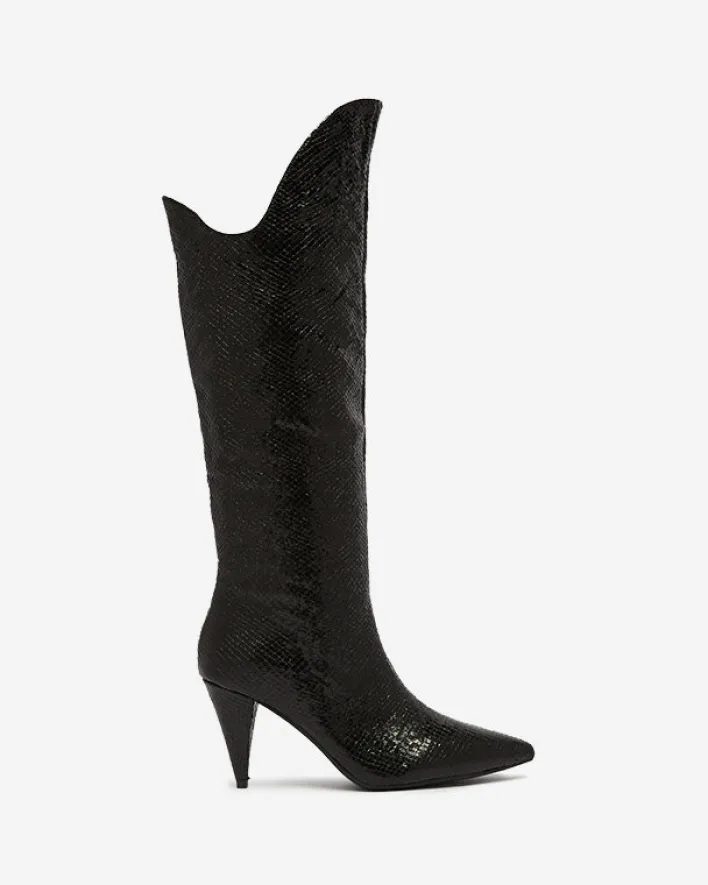 - Błyszczące damskie kozaki na szpilce wykonane z eko skóry zdobionej tłoczeniem. Posiadają delikatne ocieplenie. Model wsuwany. Nosek w szpic dodaje im charakteru! CZARNE DAMSKIE OCIEPLANE KOZAKI ELIVEA