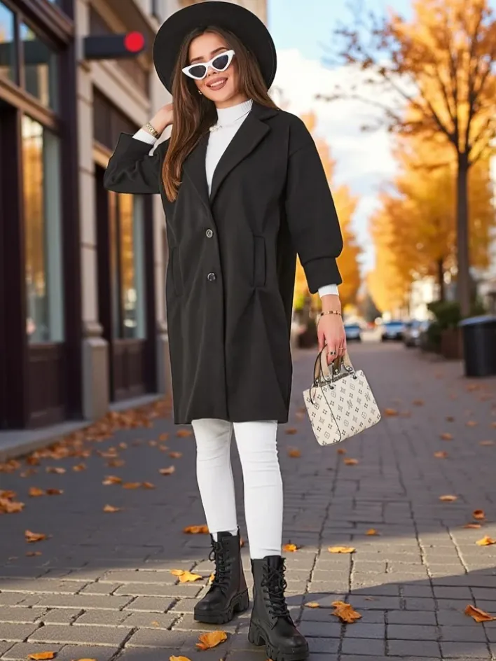 - Damski płaszcz z przyjemnego materiału. Model posiada długie rękawy i zapięcie na guziki. Posiada podszewkę. Idealna propozycja na jesień! UWAGA: Dokładność pomiaru (+/-) 1 cm. Wymiary mierzone na płasko.