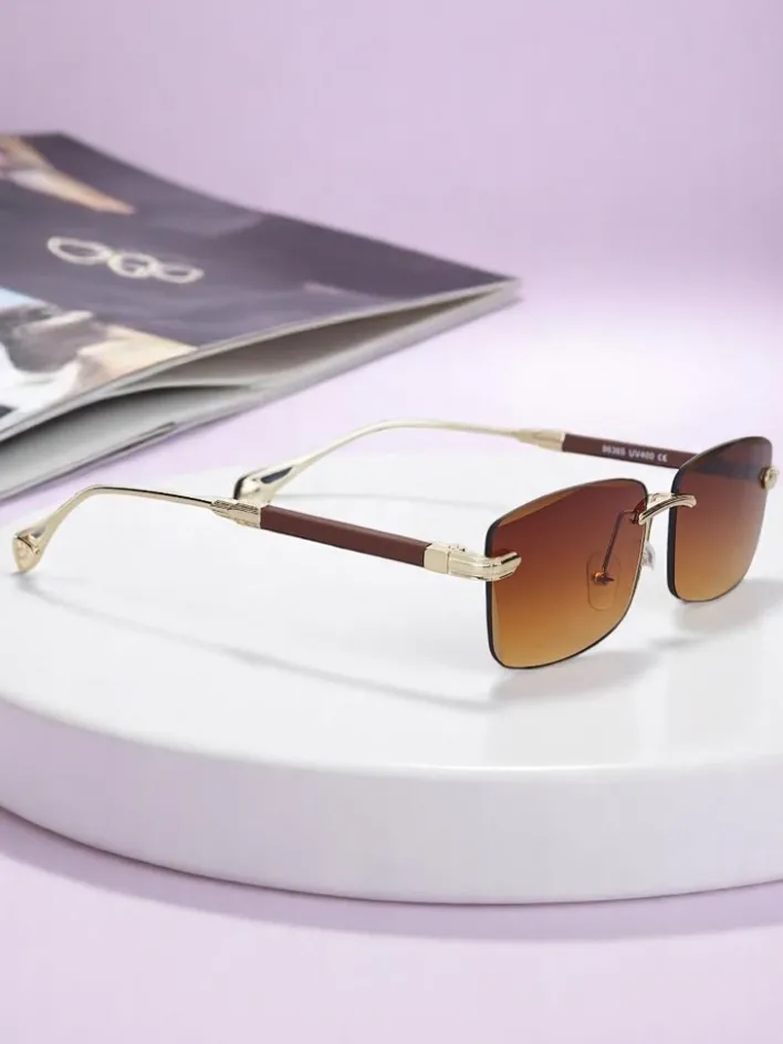 - Małe, wąskie okulary przeciwsłoneczne o prostokątnym kształcie z metalową oprawką. Styl vintage w nowoczesnym wydaniu – idealne dla fanów wyrazistych dodatków retro.