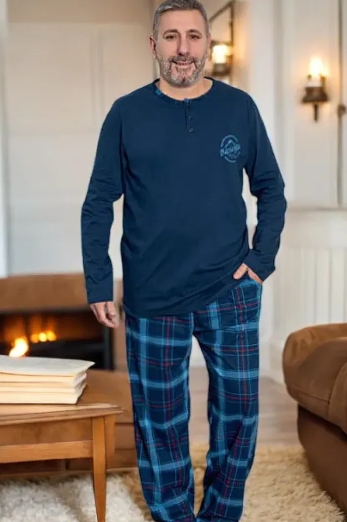 - Wygodna męska piżama 2- częściowa z długim rękawem i długimi nogawkami wykonana z materiału bawełnianego. Model posiada dwie kieszenie. Idealna na domowe wieczory! UWAGA: Dokładność pomiaru (+/-) 1 cm.