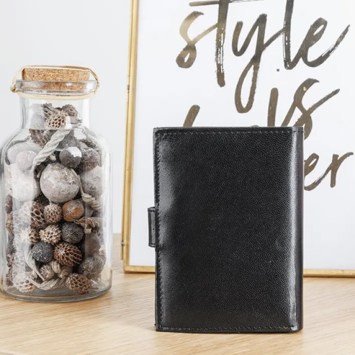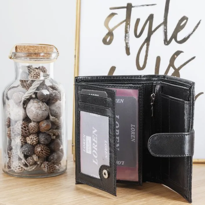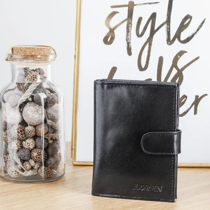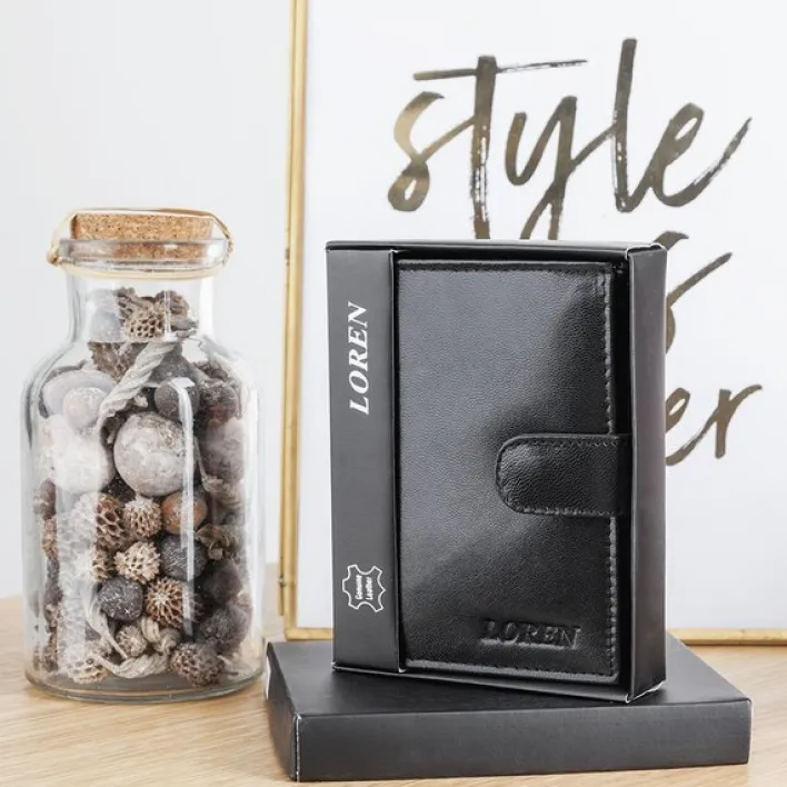 - Mały portfel męski wykonany z ekologicznej skóry zapinany guzikiem. Portfel posiada 2 duże przegrody, 10 kieszonek o rożnej wielkości oraz miejsce na bilony.