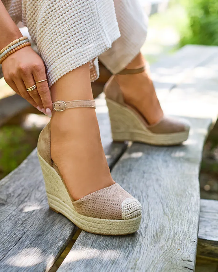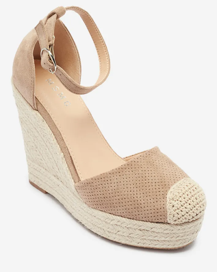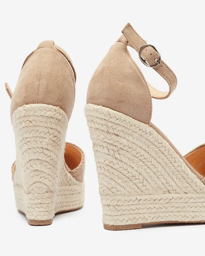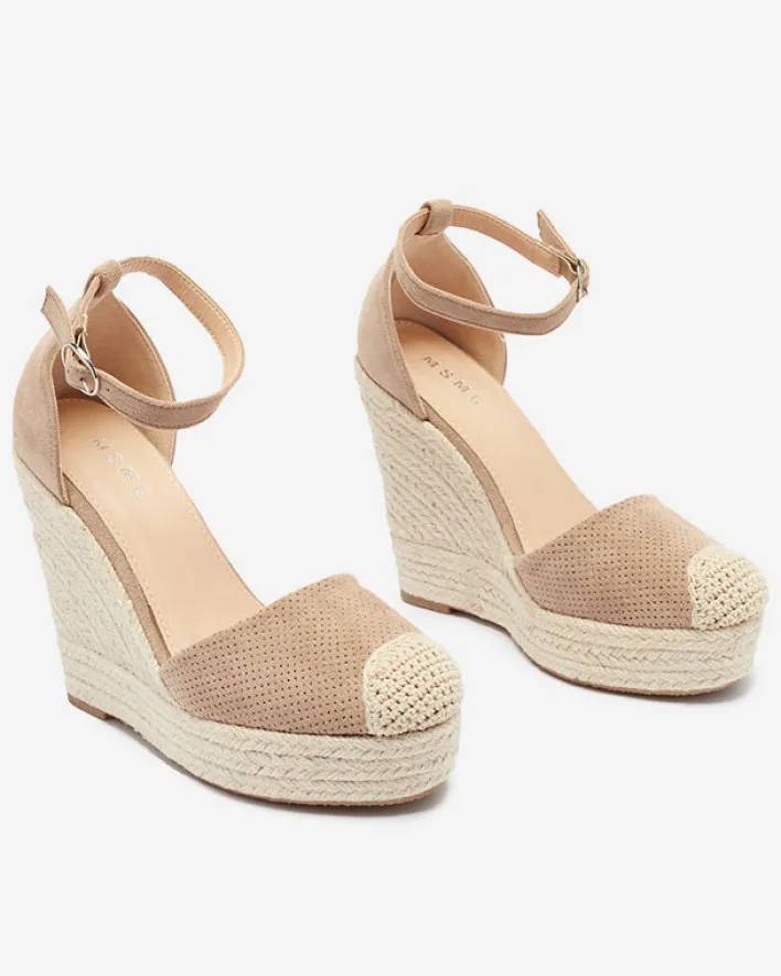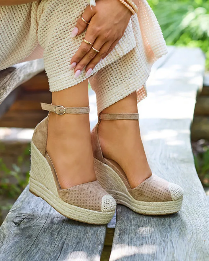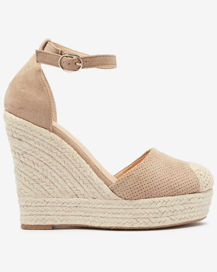 - Damskie sandały na koturnie, wykonane z eko-zamszu z ażurowym wykończeniem. Model zapinany sprzączką wokół kostki, w środku wkładka wyłożona eko-skórą. Podeszwa zdobiona sznurkiem jutowym. UWAGA: model preferowany dla osób o wąskiej anatomii stopy.