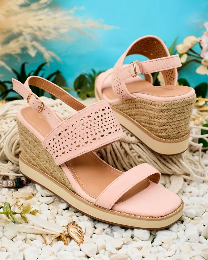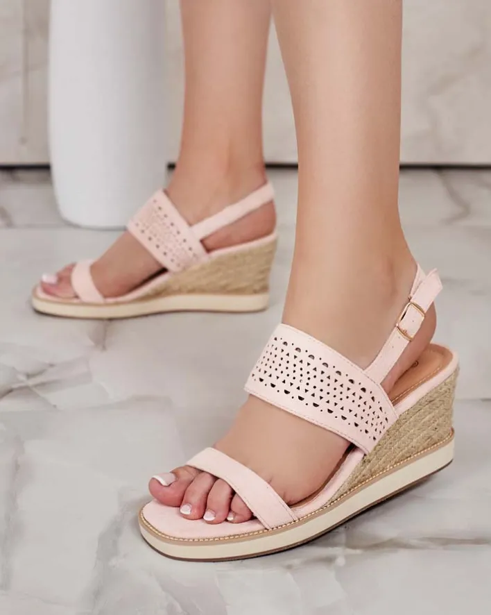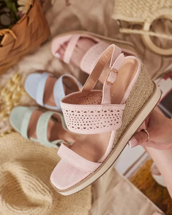 - Damskie ażurowe sandałki na platformie i koturnie, plecione ozdobnym jutowym sznurkiem. Obuwie wykonane z eko zamszu, wkładki ze skóry ekologicznej oraz zapinane na sprzączką. Doskonałe do tworzenia modnych letnich outfitów!