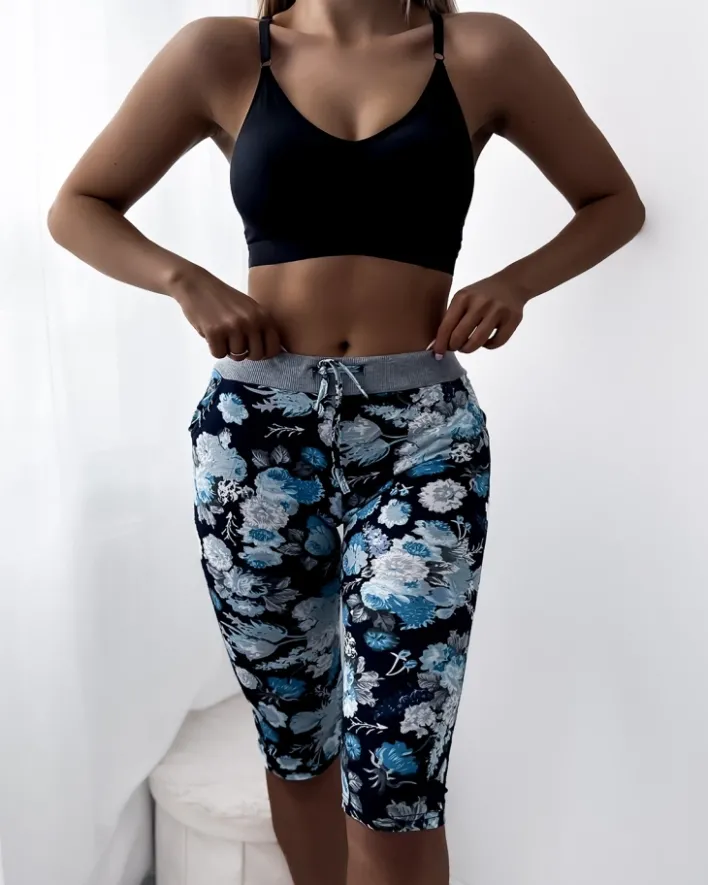- Komfortowe damskie materiałowe spodenki o długości 3/4, wykonane z tkaniny bawełnianej. Model posiada średni stan, gumkę w pasie oraz 2 wsuwane kieszenie. UWAGA: Dokładność pomiaru (+/-) 1 cm.