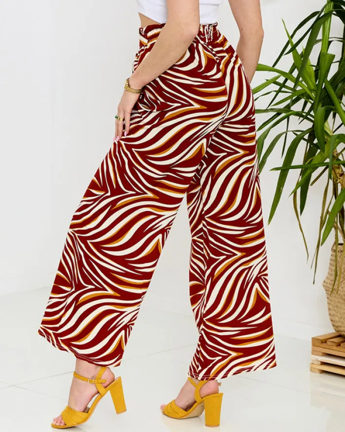 - Wzorzyste szerokie spodnie damskie. Model wykonany z lekkiej i zwiewnej tkaniny, posiada gumę oraz wiązanie podkreślające talię. Idealna baza do stylowych outfitów na wiosnę! UWAGA: Dokładność pomiaru (+/-) 1 cm.