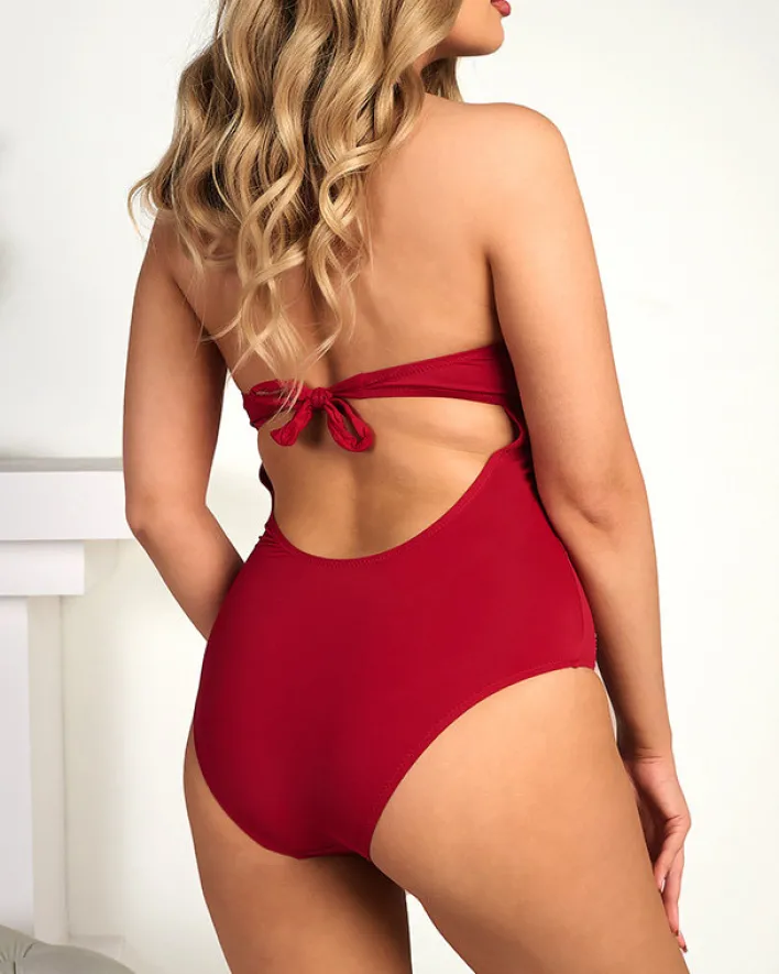 - Jednoczęściowy kostium kąpielowy damski, wiązany z tyłu. Model posiada usztywniane miseczki i ozdobny wzór z drobnych dżetów. Ten strój zrobi furorę na plaży!