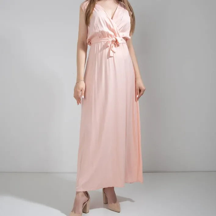 - Letnia damska sukienka maxi o lekko rozkloszowany kroju, wykonana z tkaniny poliestrowej. Model bez rękawów, z kopertowym dekoltem, w talii posiada elastyczną gumkę oraz materiałowy pasek. UWAGA: Dokładność pomiaru (+/-) 1 cm.