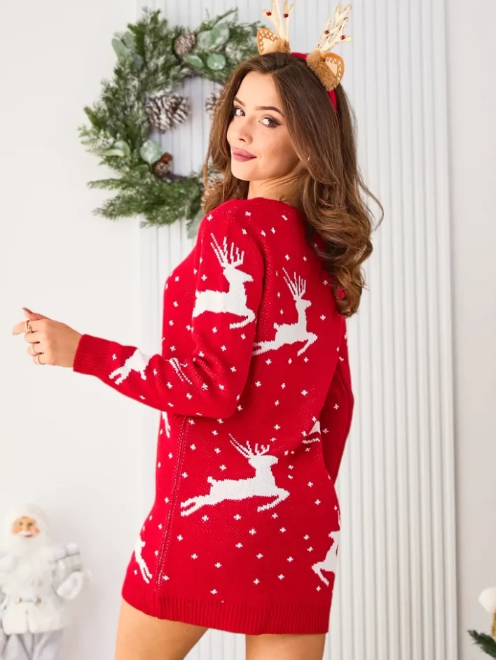 - Świąteczna swetrowa sukienka damska wykonana z ciepłego materiału dzianinowego. Model o długości mini, posiada długie rękawy i zdobiony jest oryginalnym printem. Must have w szafie każdej kobiety! UWAGA: Dokładność pomiaru (+/-) 1 cm.