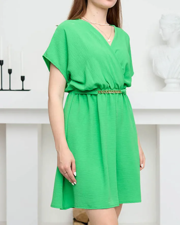 - Unikalna damska krótka sukienka z ozdobnym łańcuszkiem w pasie, wykonana z lekkiej tkaniny. Produkt z elastycznym i kopertowym dekoltem, posiada krótkie rękawy oraz gumkę w talii. Fantastyczna, elegancka sukienka! UWAGA: Dokładność pomiaru (+/-) 1 cm.