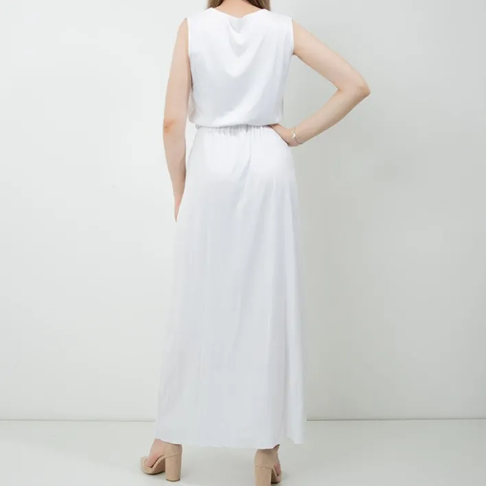 - Letnia damska sukienka maxi o lekko rozkloszowany kroju, wykonana z tkaniny poliestrowej. Model bez rękawów, z kopertowym dekoltem, w talii posiada elastyczną gumkę oraz materiałowy pasek. UWAGA: Dokładność pomiaru (+/-) 1 cm.