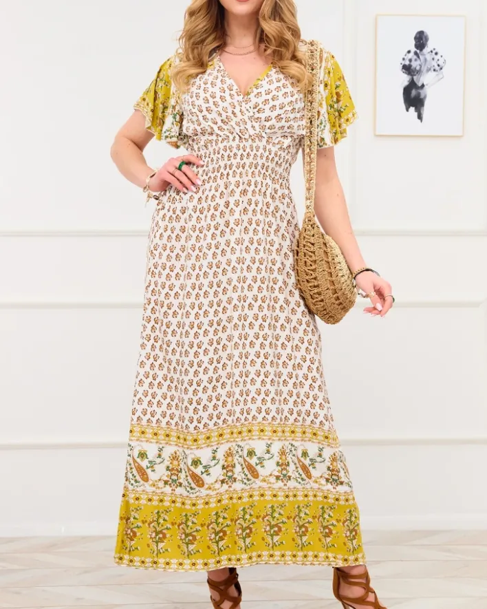 - Wzorzysta damska długa sukienka wykonana z lekkiej i zwiewnej tkaniny. Model z dekoltem V, posiada krótkie rękawy i gumkę w pasie podkreślającą talię. Świetna na lato! UWAGA: Dokładność pomiaru (+/-) 1 cm.
