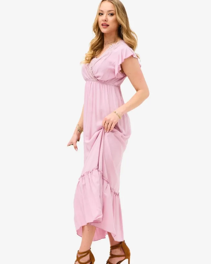 - Jednokolorowa damska sukienka o długości midi, produkt z kopertowym dekoltem zdobionym koronką. Sukienka posiada krótkie rękawy oraz cienką, elastyczną gumę w pasie. Must have w szafie każdej kobiety! UWAGA: Dokładność pomiaru (+/-) 1 cm.