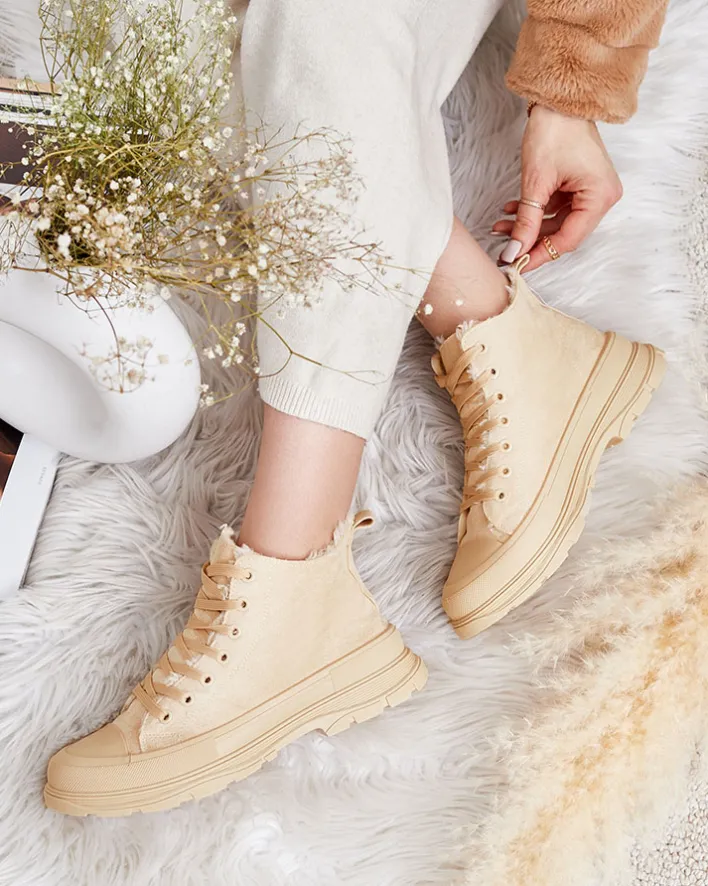 - Wyjątkowe damskie wysokie buty sportowe a’la trampki. Sznurowana cholewka jest wykonana ze skóry ekologicznej zamszowej, środek ocieplany delikatnym, miękkim futerkiem. Solidnie wykonane i bardzo wygodne dzięki miękkiej, gumowej podeszwie!