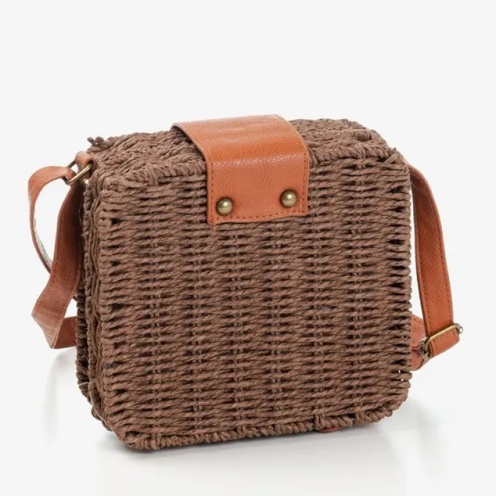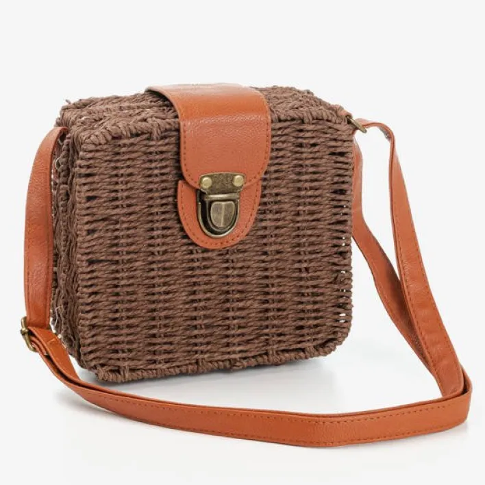 - Kwadratowa damska torebka typu kuferek wykonana z plecionej papierowej słomki w kolorze ciemnobrązowym. Posiadają zamknięcie na klamrę. Podszewka tkaninowa.