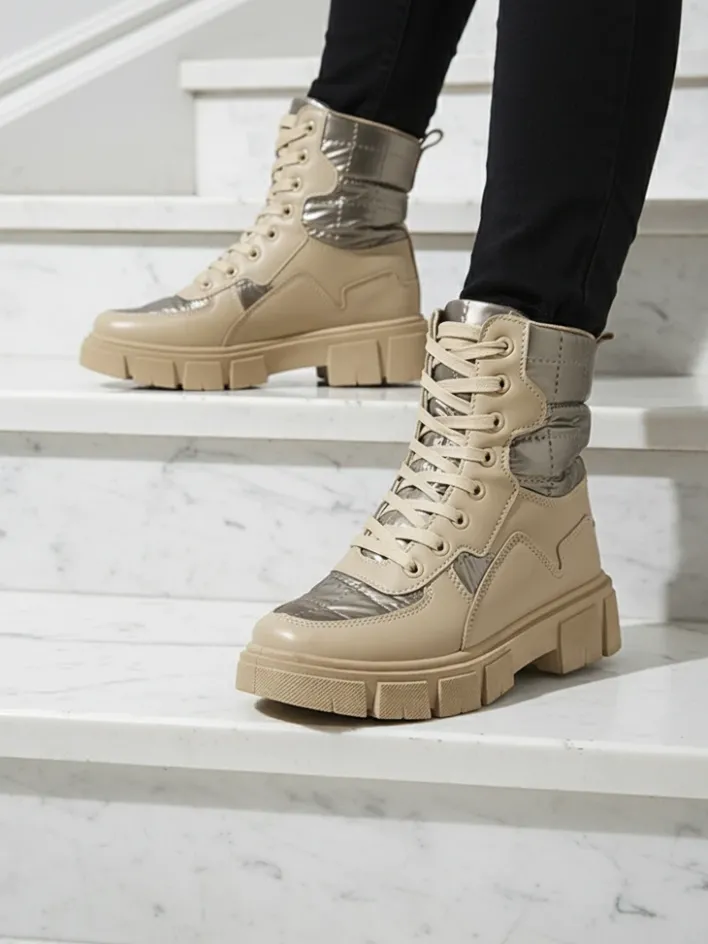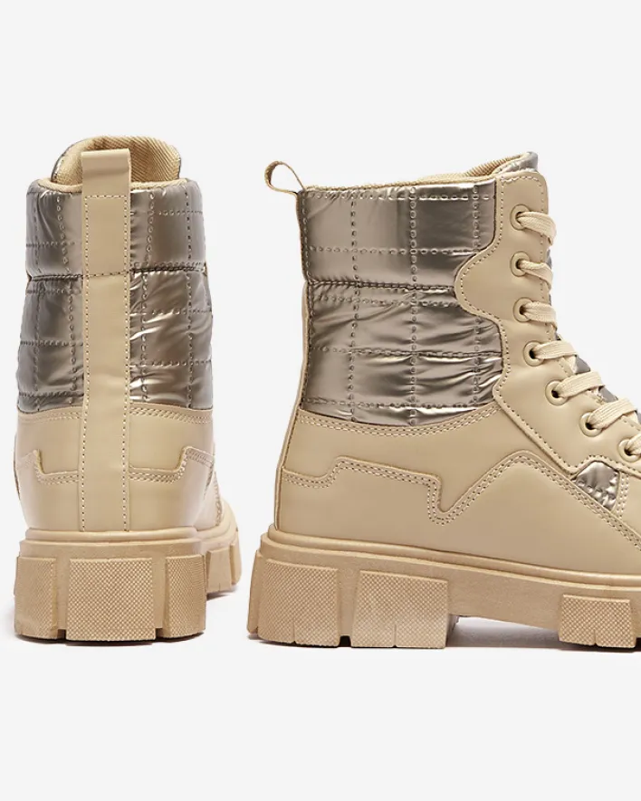 - Doskonałe damskie sznurowane botki a’la workery, cholewka wykonana jest z połączenia skóry ekologicznej oraz sztucznego materiału a’la cerata z pikowanym wykończeniem. Środek wyłożony tkaniną.
