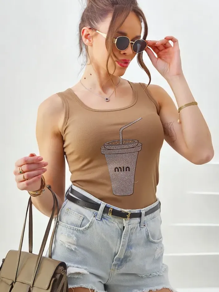 - Casualowa bluzka damska na ramiączkach, która podkreśla kobiecą delikatność. Miękki materiał otula sylwetkę, a okrągły dekolt i nadruk z cyrkonii dodają wyrafinowanego akcentu. Idealna na co dzień jak i specjalne okazje!