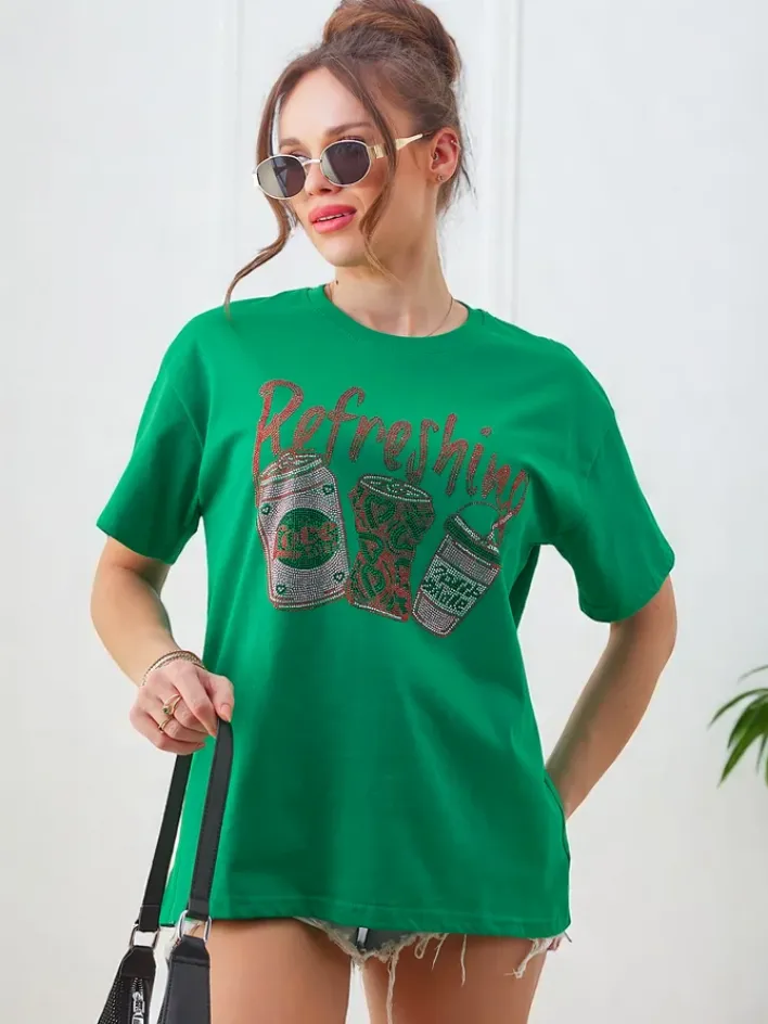 - Bawełniany damski t-shirt z nadrukiem ozdobionym cyrkoniami, łączący wygodę z subtelnym blaskiem. Idealny do casualowych stylizacji, dodaje wyjątkowego uroku każdemu lookowi.