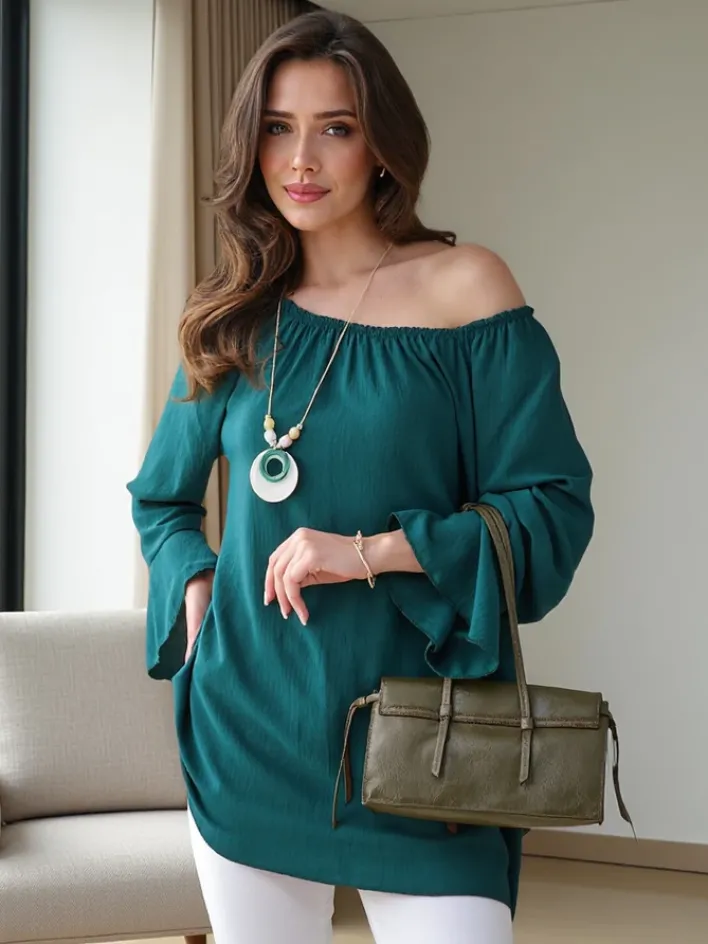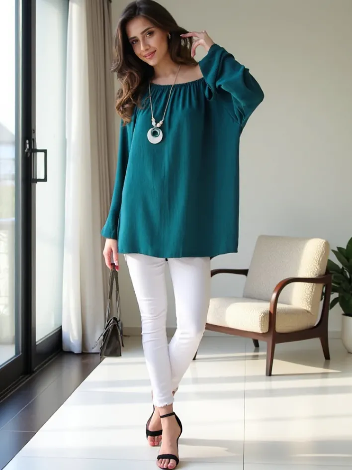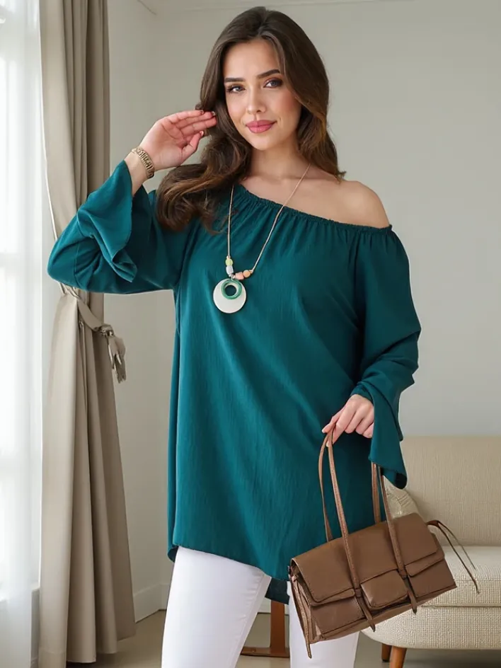 - Wyjątkowa damska bluzka a’la hiszpanka wykonana z miękkiego, przyjemnego materiału. Posiada okrągły dekolt z gumką oraz rękawy zdobione falbankami. Dodatkowo naszyjnik w zestawie. Idealna na co dzień jak i specjalne okazje!