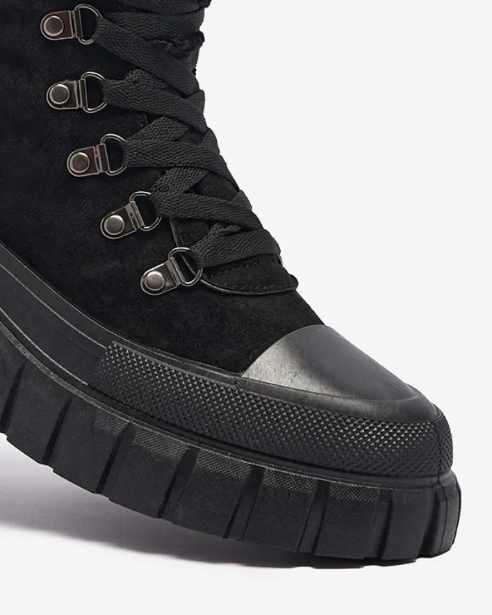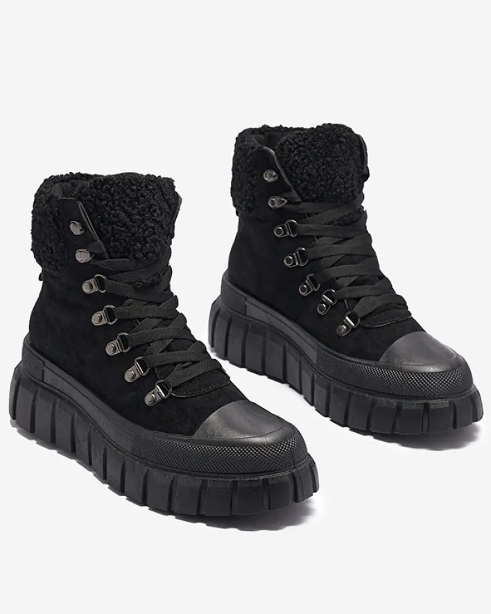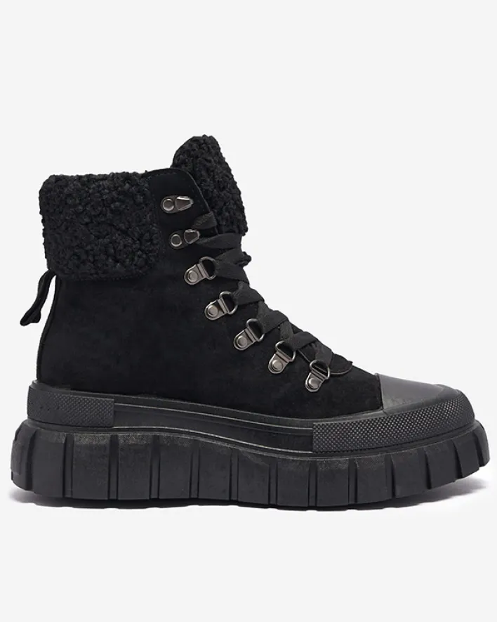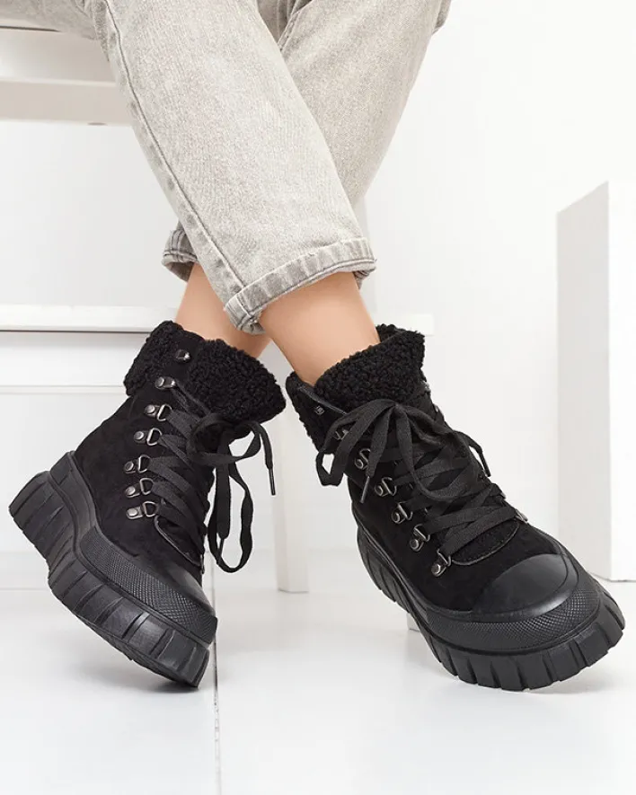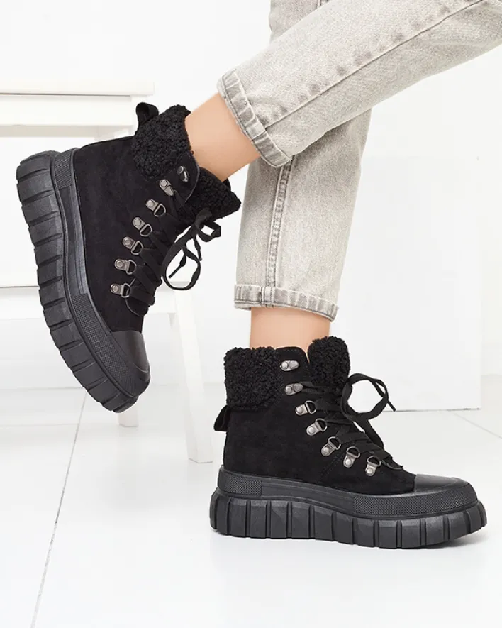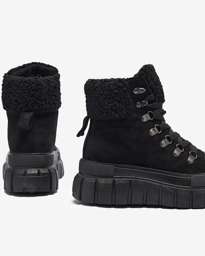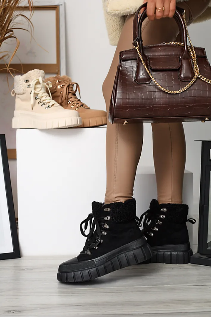 - Super stylowe damskie botki na grubszej podeszwie, wykonane ze skóry eko-zamszowej. Model jest sznurowany, środek wyłożony tkaniną. Cholewka zdobiona kożuszkiem w dopasowanym kolorze. Idealna para na co dzień! CZARNE NIEOCIEPLANE BUTY BOTKI VETIC