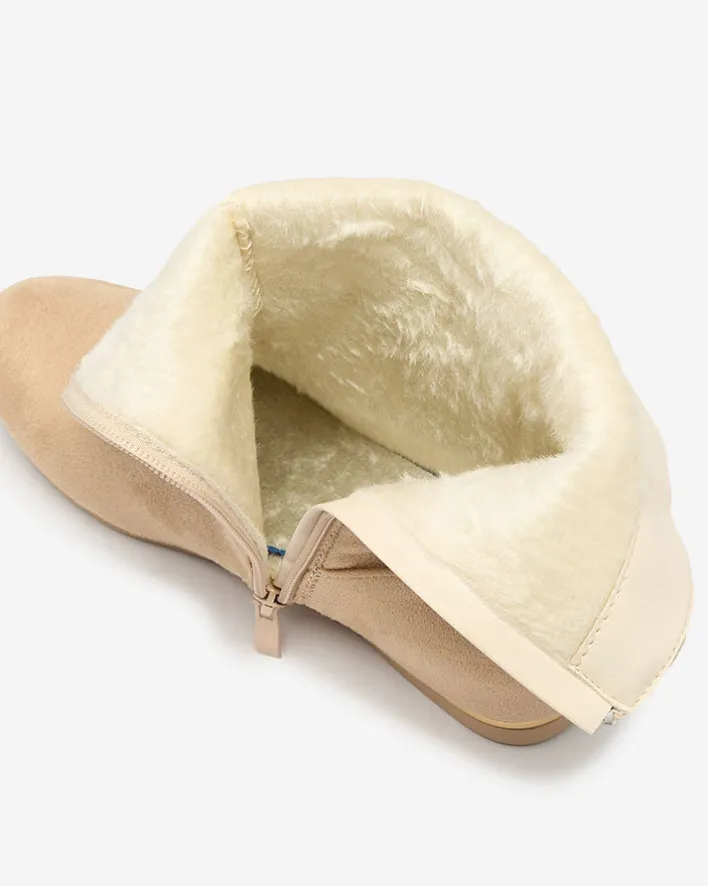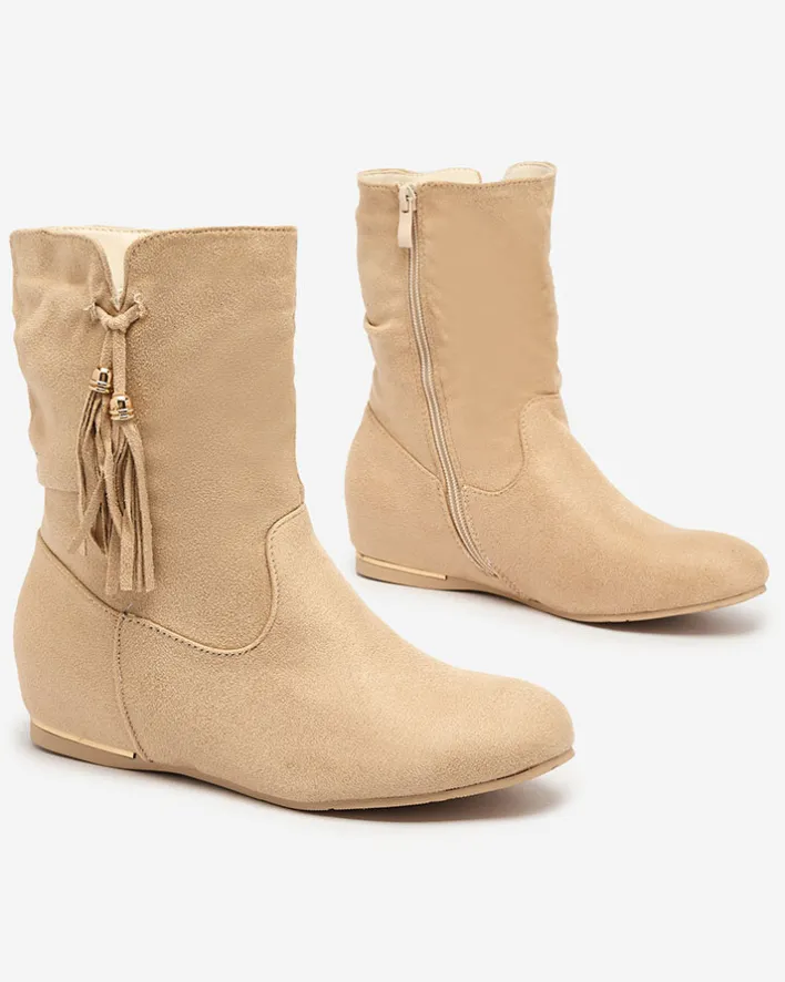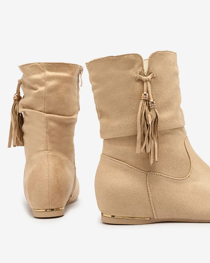 - Stylowe botki wykonane ze skóry ekologicznej zamszowej. Buty posiadają ukryty koturn w środku. Model zapinany suwakiem po boku. Na wysokości cholewki mają ozdobny frędzelek. Idealne do wielu kobiecych stylizacji.