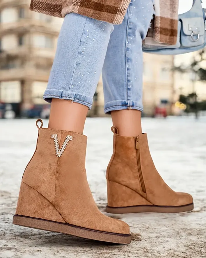 - Eleganckie damskie botki na koturnie, wykonane z eko-zamszu. Obuwie wypełnione od środka futerkiem. Idealny wybór na jesień!
